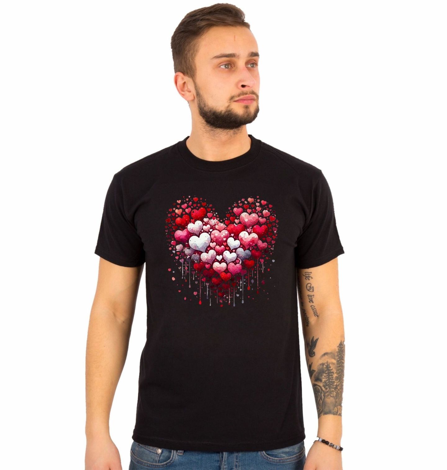 Pánské tričko Nezkrotná Láska. Výrazný motiv ve tvaru srdce složeného z desítek menších srdíček symbolizuje láska v celé její hloubce a intenzitě. Tento design je jako stvořený pro valentýn, kdy srdce představuje blízkost, vášeň i něhu. Láska zde není jen symbolem, ale hlavním sdělením – silná, živá a nepřehlédnutelná.