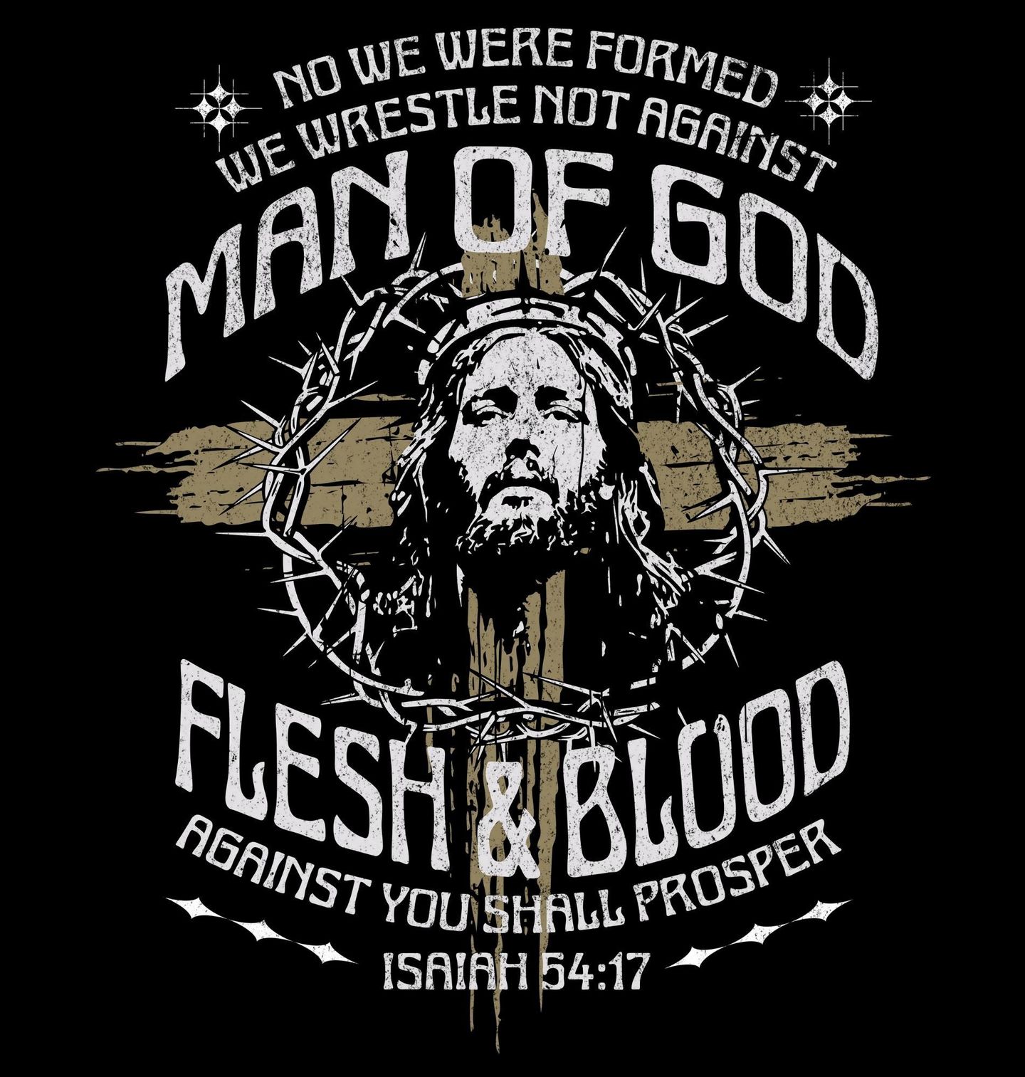 Pánské tričko Nezlomitelný Ježíš Kristus. "No weapon formed against you shall prosper. We wrestle not against flesh & blood." česky "Žádná zbraň utvořená proti tobě nebude mít úspěch. Nebojujeme proti tělu a krvi." Silný křesťanský motiv s vyobrazením Ježíše Krista s trnovou korunou a křížem v pozadí. Design obsahuje biblický verš z Izajáše 54:17 a poselství víry a ochrany.