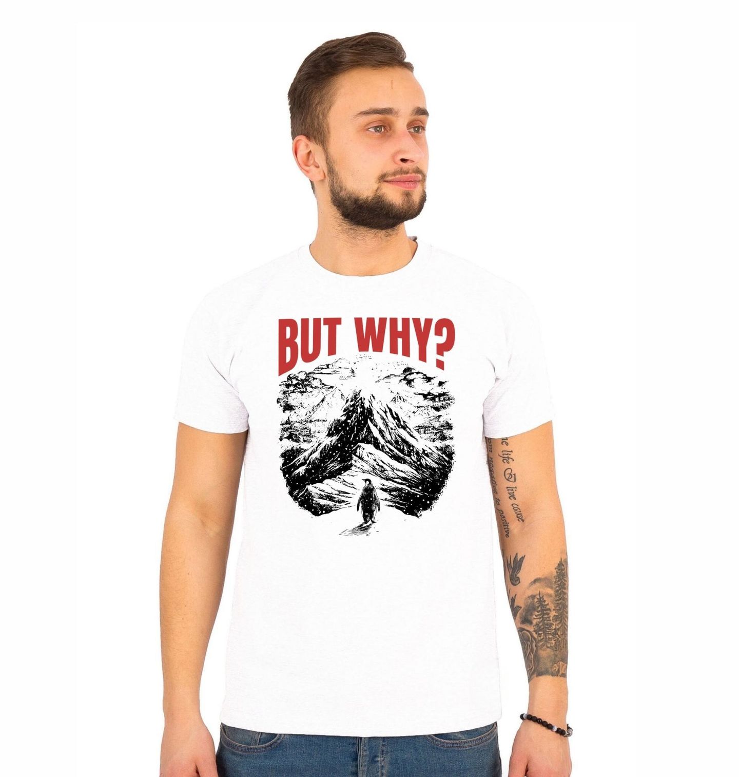 Pánské tričko Nihilistický Tučňák But Why? „The nihilist penguin“ je virální internetový meme z roku 2026 a kulturní symbol pocházející z dokumentu z roku 2007 od Wernera Herzoga Encounters at the End of the World. Zobrazuje osamělého tučňáka, který se vzdaluje od své kolonie a míří vstříc jisté smrti v zamrzlých horách, místo aby šel k moři za přežitím.