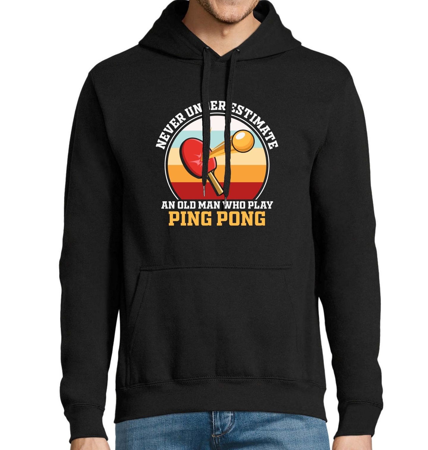 Pánská mikina Nikdy nepodceňuj starého muže, který hraje stolní tenis. Nevěřte vzhledu – zkušenosti, preciznost a smrtící topspin přicházejí s věkem. Tento motiv je poctou všem zkušeným pingpongovým bojovníkům, kteří i dnes vládnou stolu. Respekt k hře. Respekt ke starému pánovi.