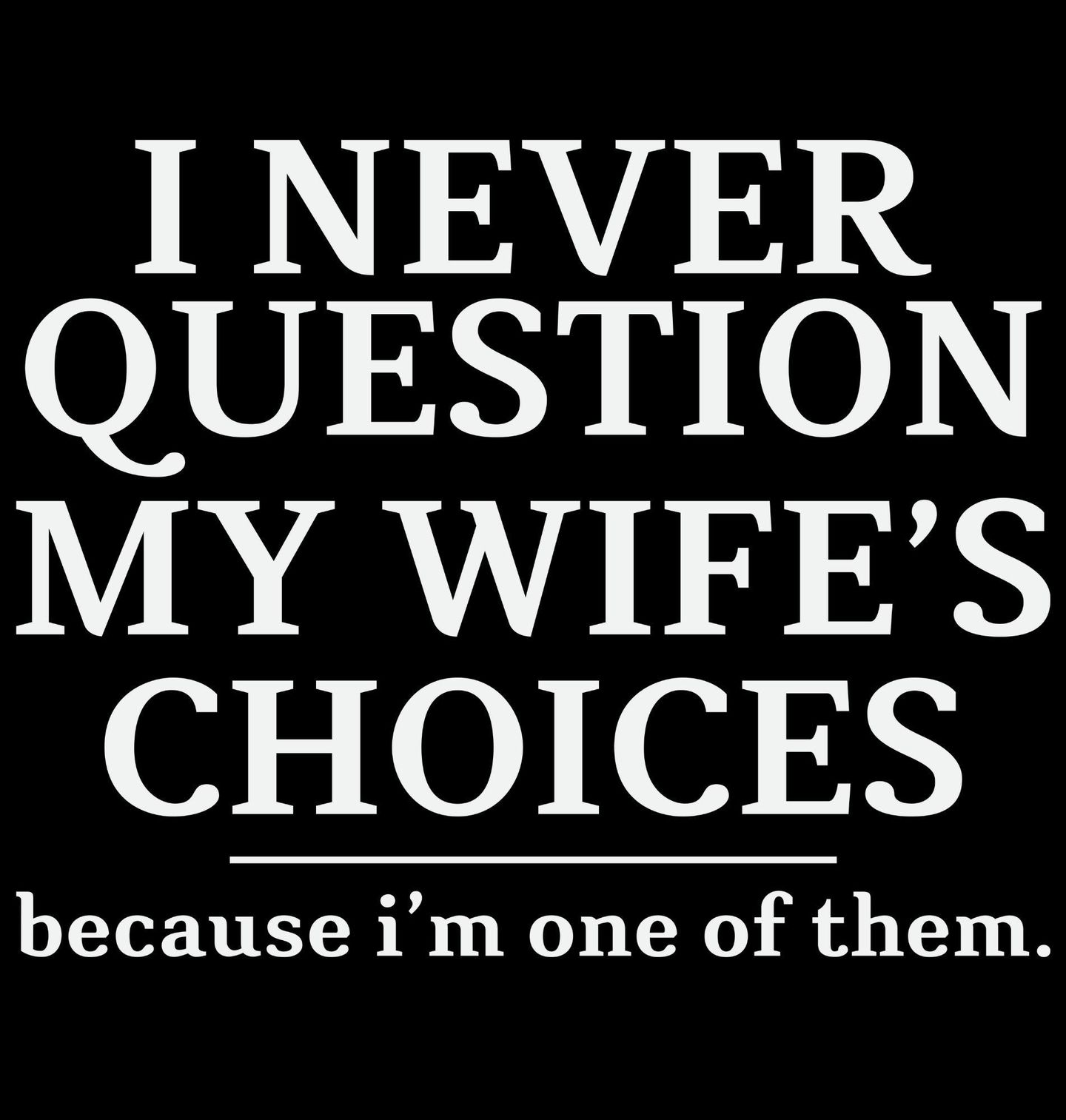 Pánské tričko Nikdy nezpochybňuju volby své ženy. Hledáte originální dárek pro manžela nebo stylové tričko, které s nadhledem vyjádří realitu manželství? I never question my wife’s choices - because I’m one of them česky Nikdy nezpochybňuju volby své ženy - protože jsem jedna z nich je ideální kombinací humoru, lásky a sebeironie.