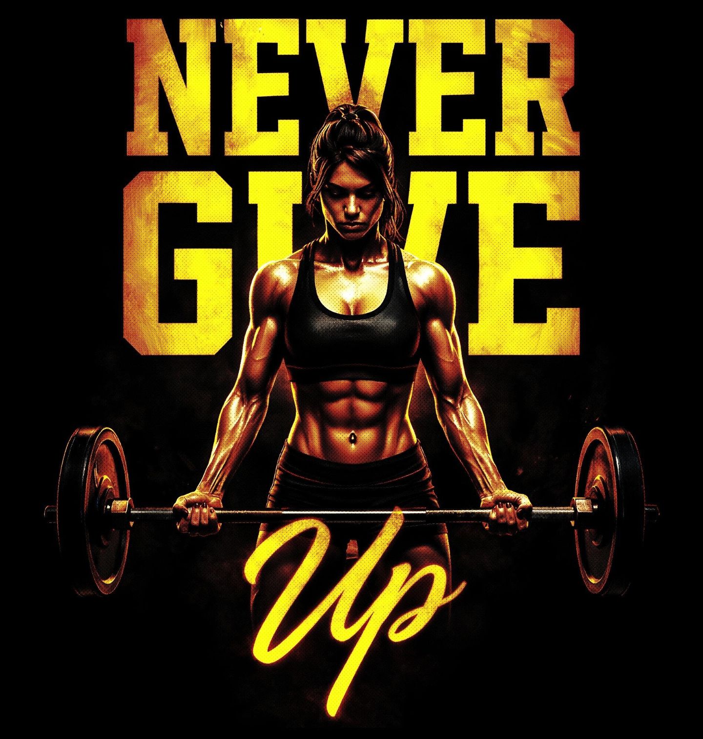 Dámské tričko Nikdy se nevzdávej Never Give Up. Motiv plný odhodlání, síly a disciplíny. Dominantní postava při zvedání činky dokonale vystihuje svět gym a každodenní posilování, kde se buduje nejen tělo, ale i mysl. Tento design je ideální pro všechny, kdo žijí fitness životem. Gym není jen místo, je to mindset. Posilování je cesta plná výzev, ale právě ty tě posouvají dál.