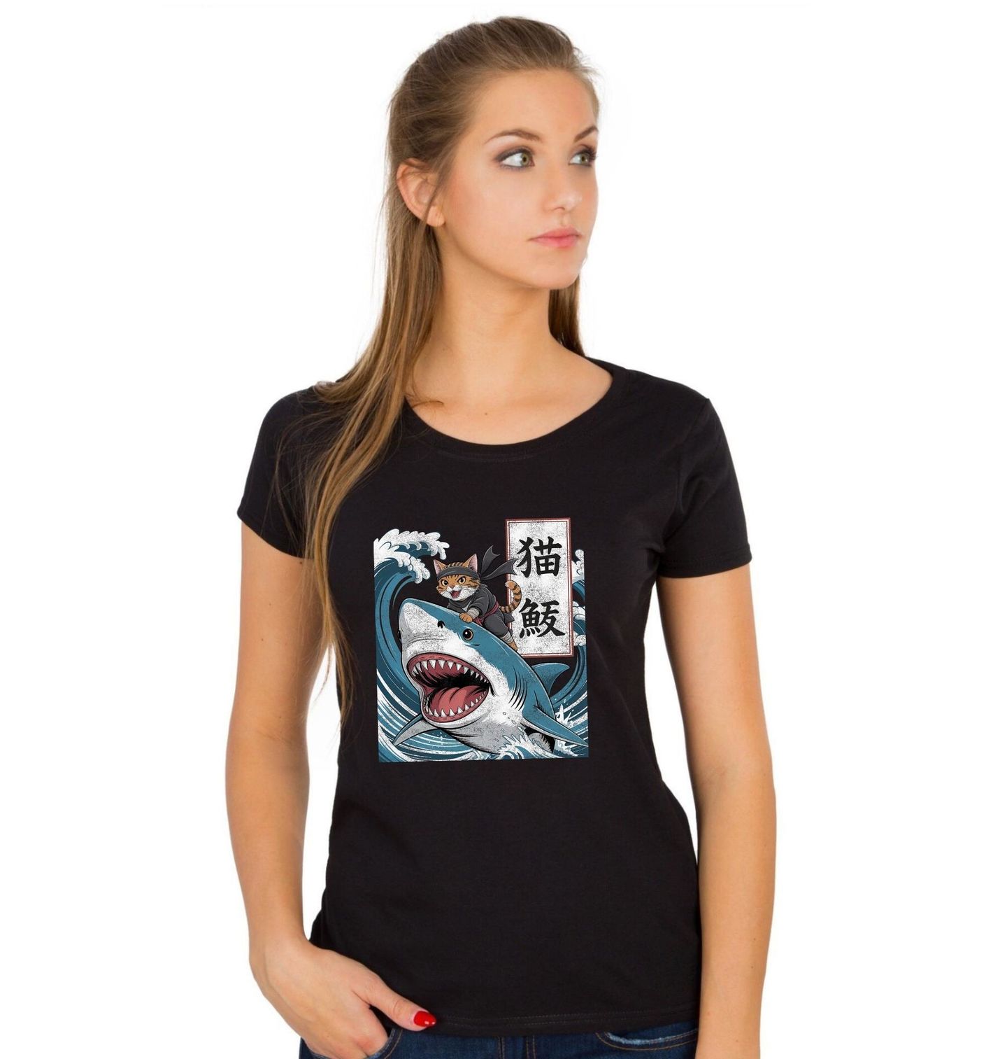 Dámské tričko Ninja Kočka na Žralokovi Ukiyo-e Art. Originální a vtipný motiv, ve kterém je hlavní hrdinkou kočka převlečená za ninju, která jede na hřbetě obrovského žraloka přes mořské vlny. Na obrázku je také japonský nápis 猫飯 (neko meshi), což doslova znamená „kočičí jídlo / kočičí rýže“. Tento motiv je ideální pro všechny, kdo milují kočky, žraloky a Japonsko.