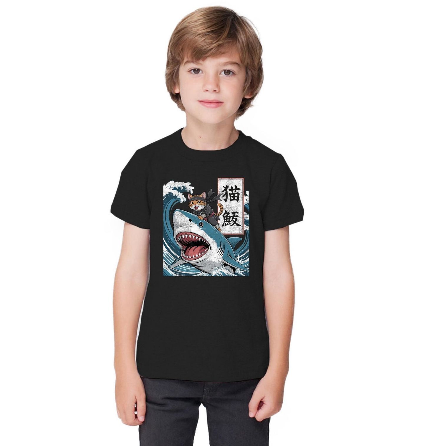 Dětské tričko Ninja Kočka na Žralokovi Ukiyo-e Art. Originální a vtipný motiv, ve kterém je hlavní hrdinkou kočka převlečená za ninju, která jede na hřbetě obrovského žraloka přes mořské vlny. Na obrázku je také japonský nápis 猫飯 (neko meshi), což doslova znamená „kočičí jídlo / kočičí rýže“. Tento motiv je ideální pro všechny, kdo milují kočky, žraloky a Japonsko.