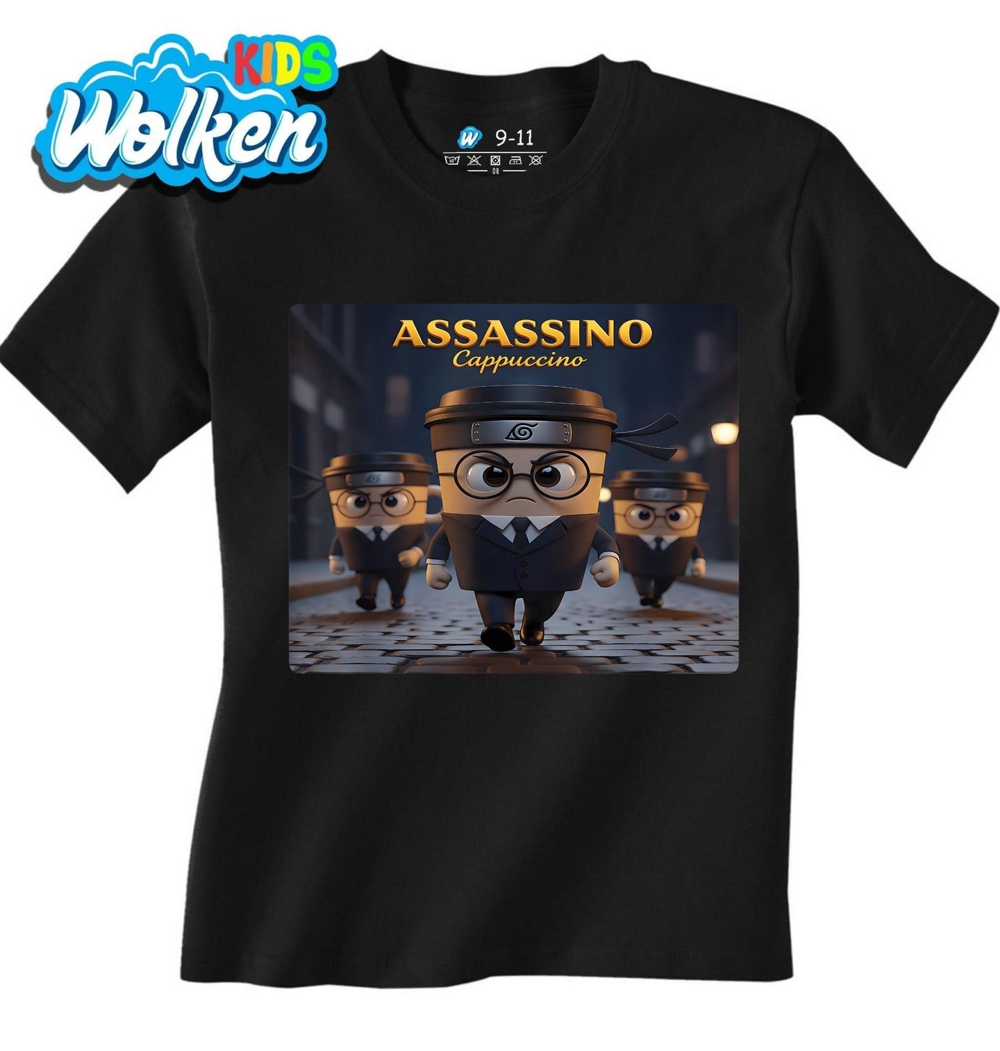Dětské tričko Ninjové Cappuccino assassíni. Italský brainrot Assassino Cappuccino v té nejkrémovější podobě! Tento vtipný motiv zachycuje odhodlané šálky cappuccina v mafiánských oblecích a čelence ninjů, kteří vypadají jako elitní tým – připravený zabít ospalost jedním douškem. Skvělý dárek pro každého milovníka kávy a meme.