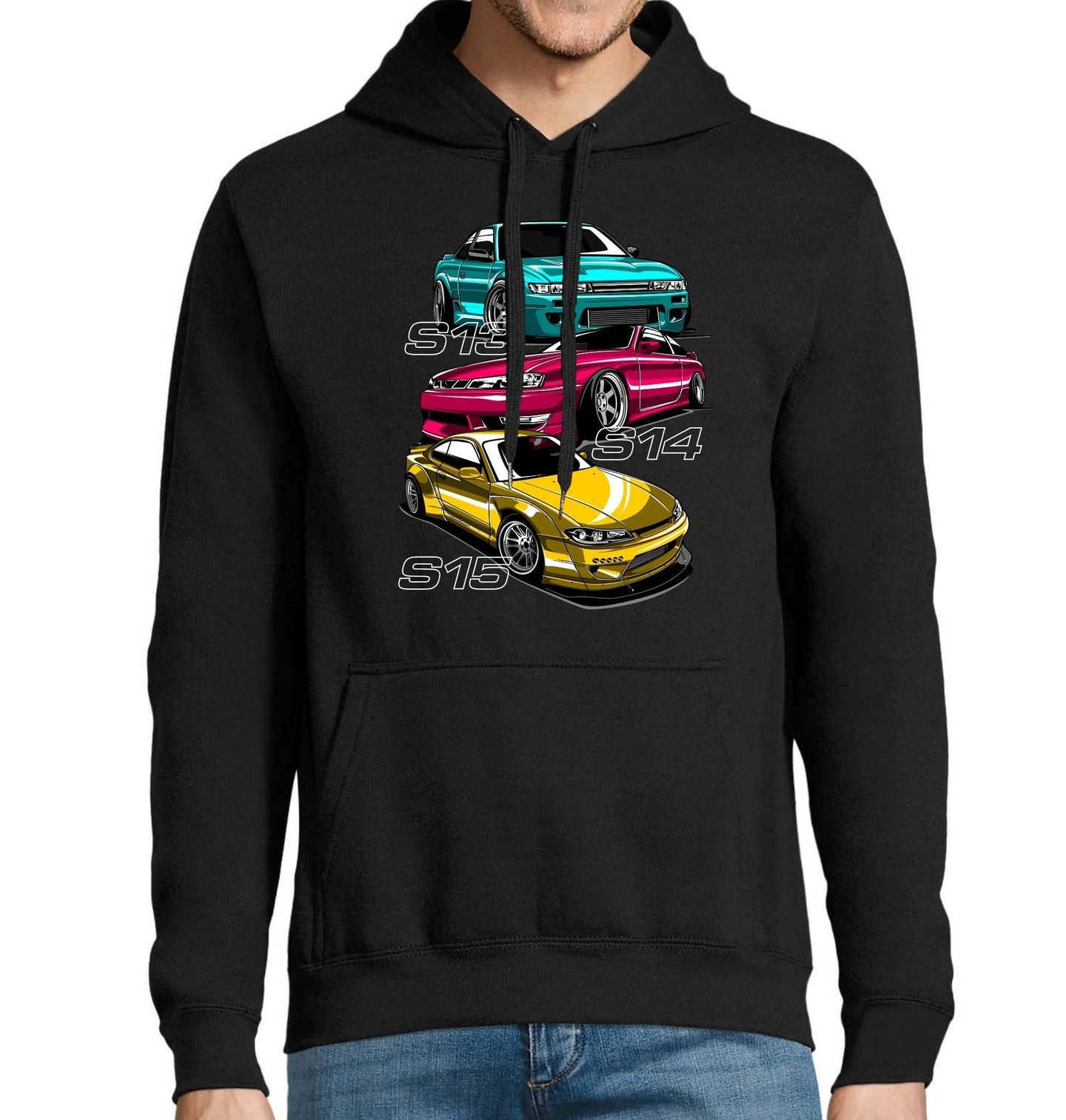 Pánská mikina Nissan Silvia S13, S14 a S15. Motiv zobrazuje legendární japonské sportovní vozy Nissan Silvia S13, S14 a S15, které patří mezi nejznámější JDM drift platformy. Každá generace má vlastní charakter, ale všechny spojuje zadní náhon a silná tuningová scéna, kterou proslavilo právě Japonsko. Tento motiv ocení každý fanoušek JDM stylu, protože auto zde symbolizuje rychlost, precizní ovladatelnost a autentickou atmosféru nočních ulic.