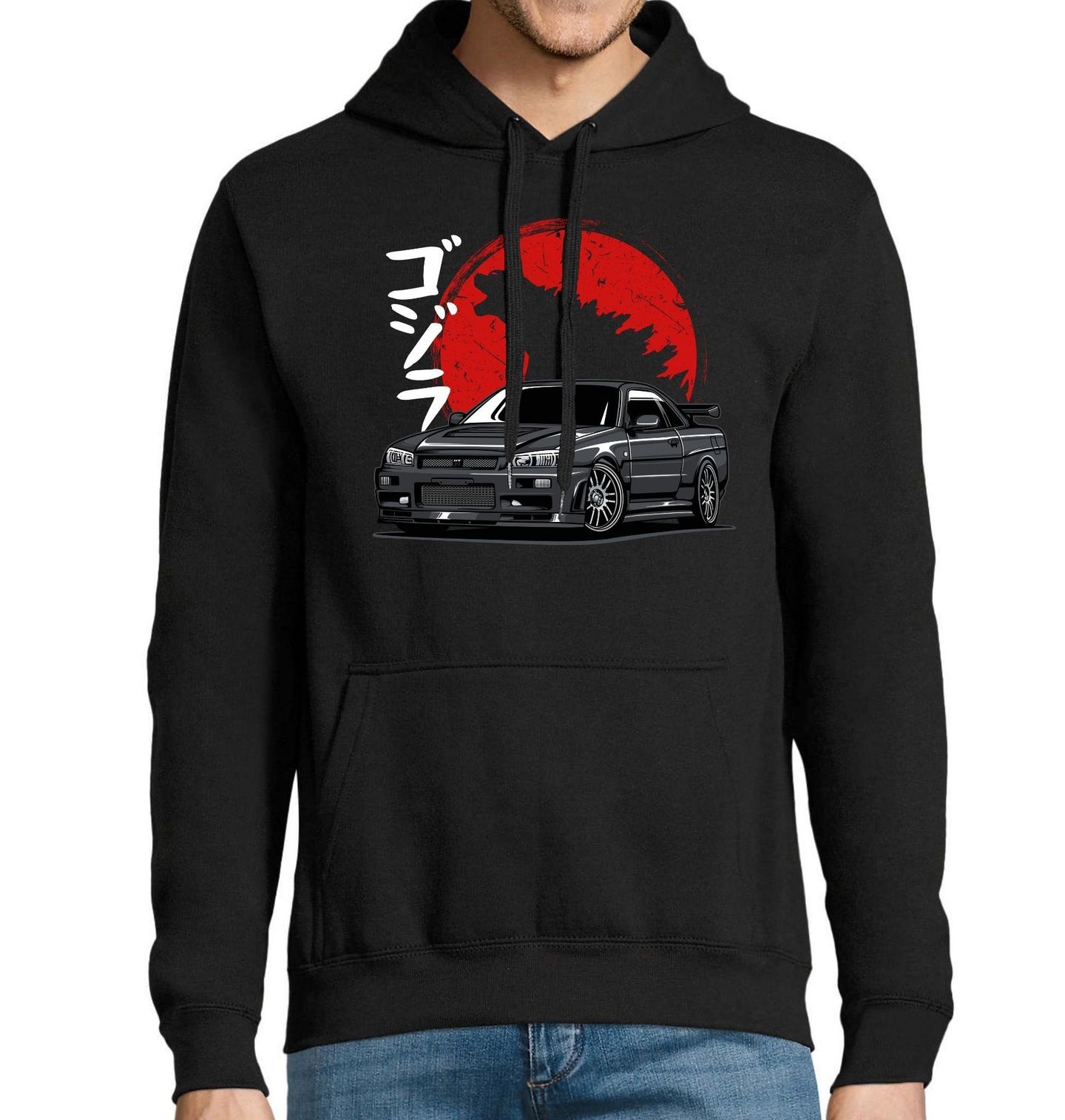 Pánská mikina Nissan Skyline Godzila Tokyo Drift. Motiv je inspirovaný legendárním japonským sportovním vozem Nissan Skyline GT-R R34. Nejde o oficiální licenci, ale o stylizované JDM auto doplněné siluetou monstra ve stylu godzila v pozadí. Originální design spojuje ikonické japonské auto inspirované legendou Nissan Skyline s dramatickým motivem Godzila a červeným sluncem, které evokuje Japonsko a jeho unikátní popkulturu.