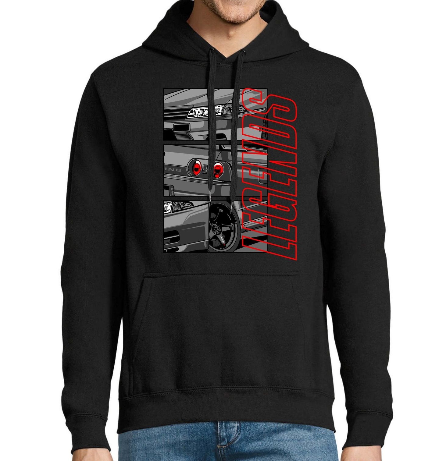 Pánská mikina Nissan Skyline Legends. Na ilustraci je japonské auto Nissan Skyline GT-R R32, sportovní vůz vyráběný na začátku 90. let, který si vysloužil přezdívku „Godzilla“ díky své dominanci na závodních tratích. Grafika zvýrazňuje charakteristické prvky vozu – přední světla, legendární kulatá zadní světla a sportovní postoj, který definoval celou generaci japonských sportovních aut.