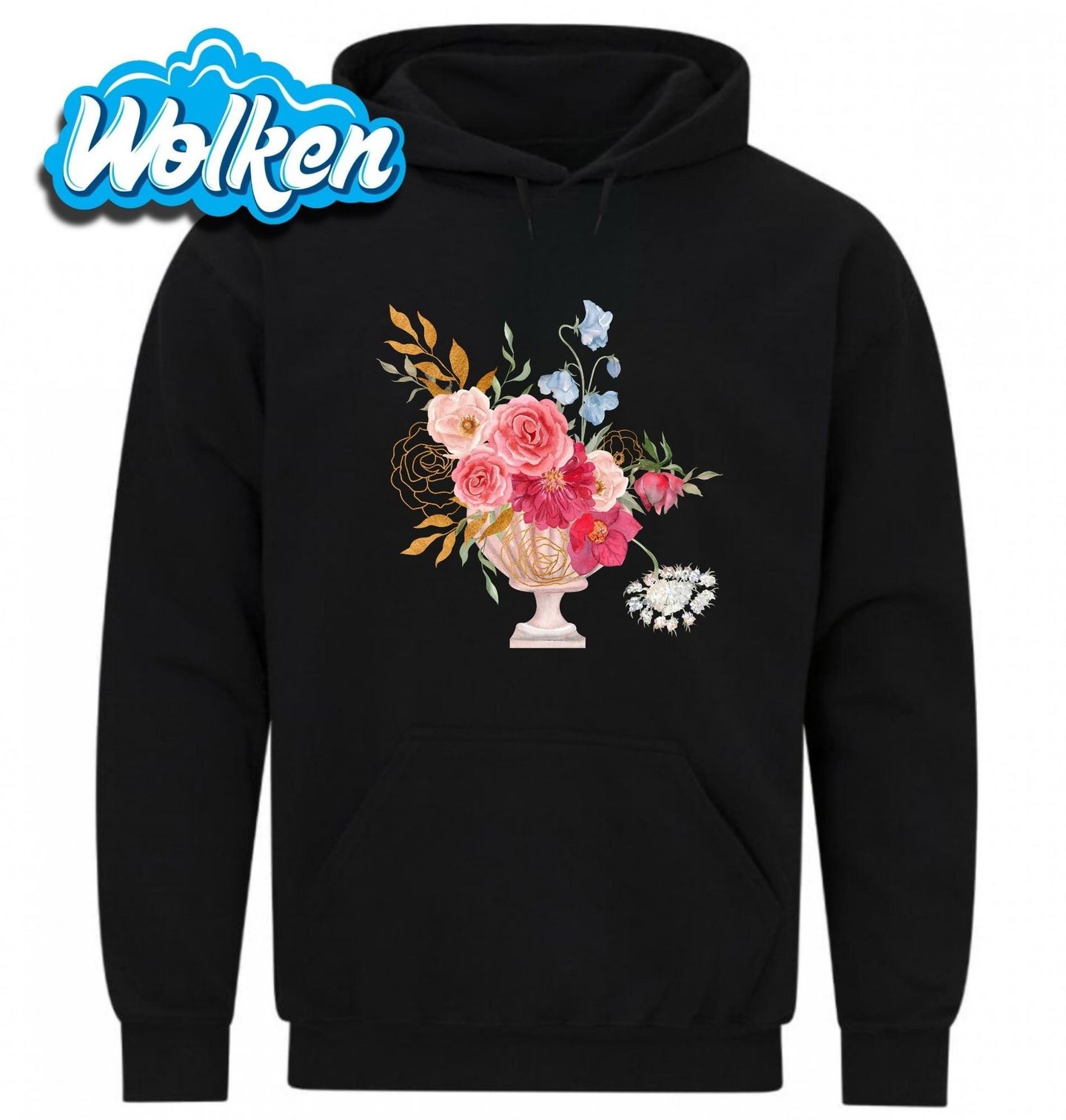 Pánská mikina Noblesní Váza Květin. Design zobrazuje stylizovanou vázu se zlatými liniemi, z níž vyrůstá umělecká kytice složená z květin jako jsou růže, pivoňky, mečíky, hrachor a další romantické květy. Květiny jsou doplněny o jemné zlaté ornamenty, které dodávají celému motivu noblesu. Perfektní pro jaro, léto nebo jako dárek pro každou květinovou duši.