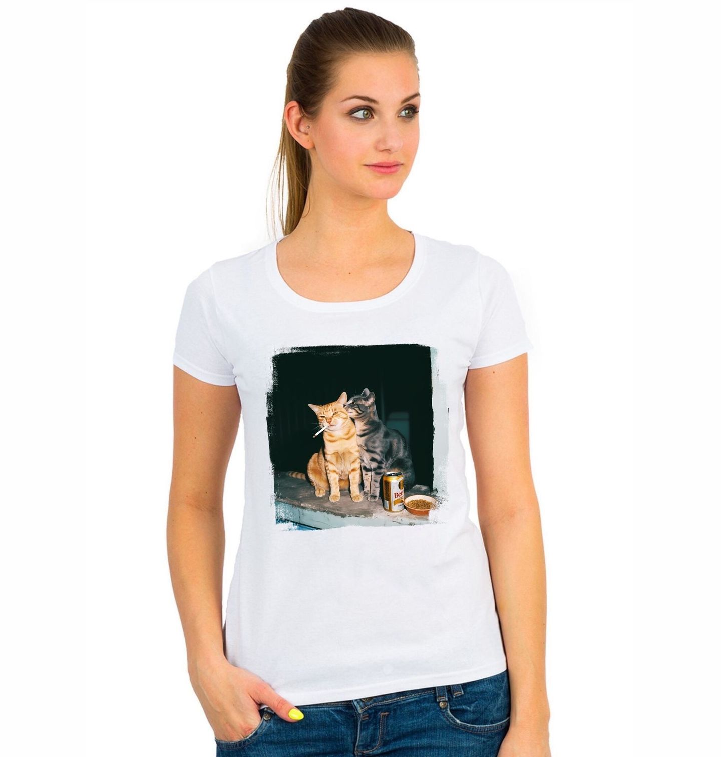 Dámské tričko Noční Bohémské Kočky. Tento design kombinuje humor, nadsázku a městský styl, který zaujme každého, kdo má rád odvážné a neotřelé motivy. Kočka v tomto provedení působí jako drsný pouliční parťák, zatímco pivo a cigareta dodávají celému obrazu rebelskou atmosféru. Detailní zpracování a realistický nádech vytváří silný vizuální dojem, který se jen tak neztratí.