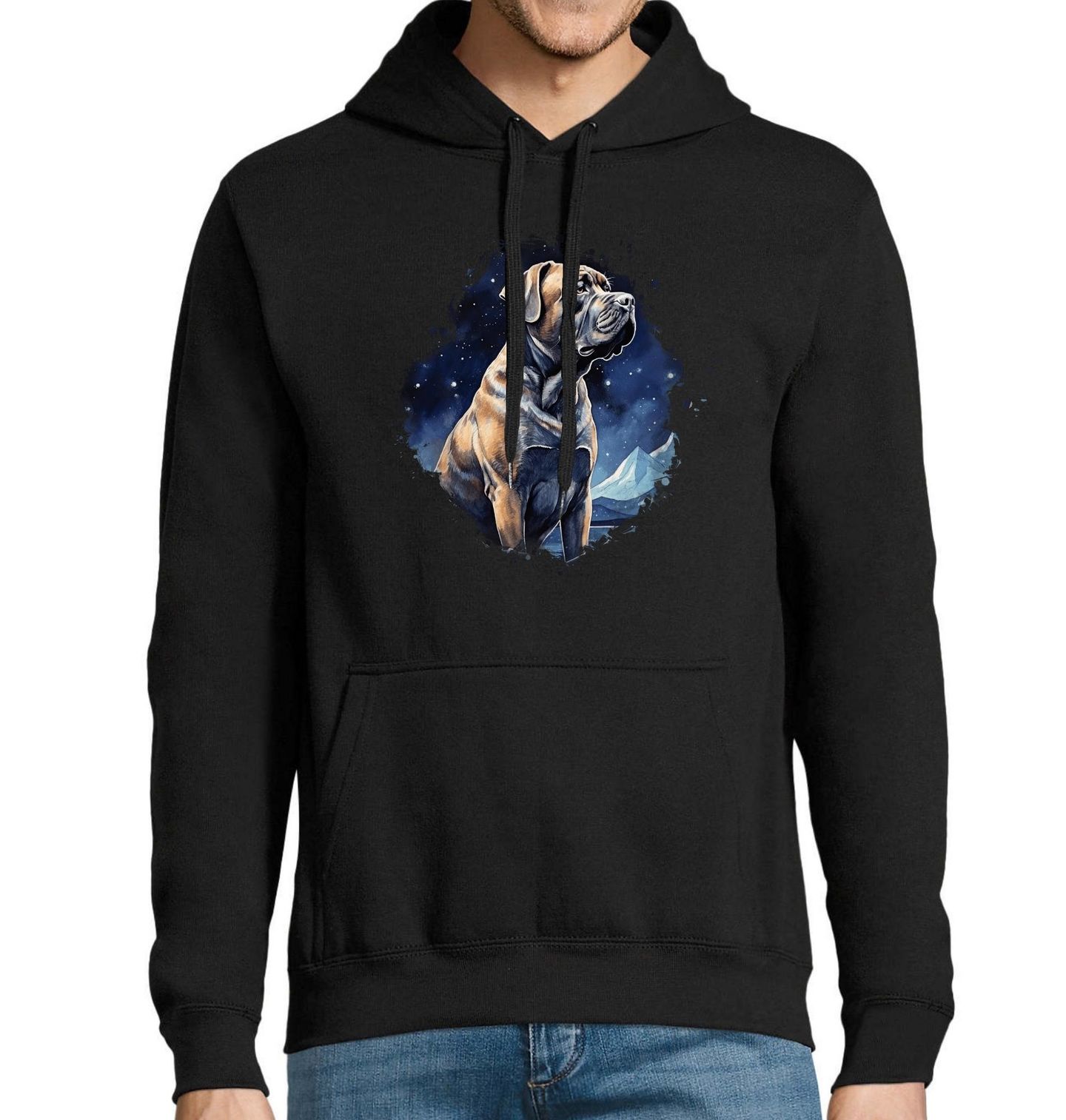 Pánská mikina Noční Hlídač Cane Corso. Cane Corso vystihuje sílu, klid a odhodlání, které každý pes tohoto druhu v sobě nese. Ilustrace noční scenérie podtrhuje jeho roli ochránce, tichého pozorovatele a věrného společníka. Perfektní dárek pro každého pejskaře, který miluje výrazné, drsné a zároveň stylové designy se psí tematikou.