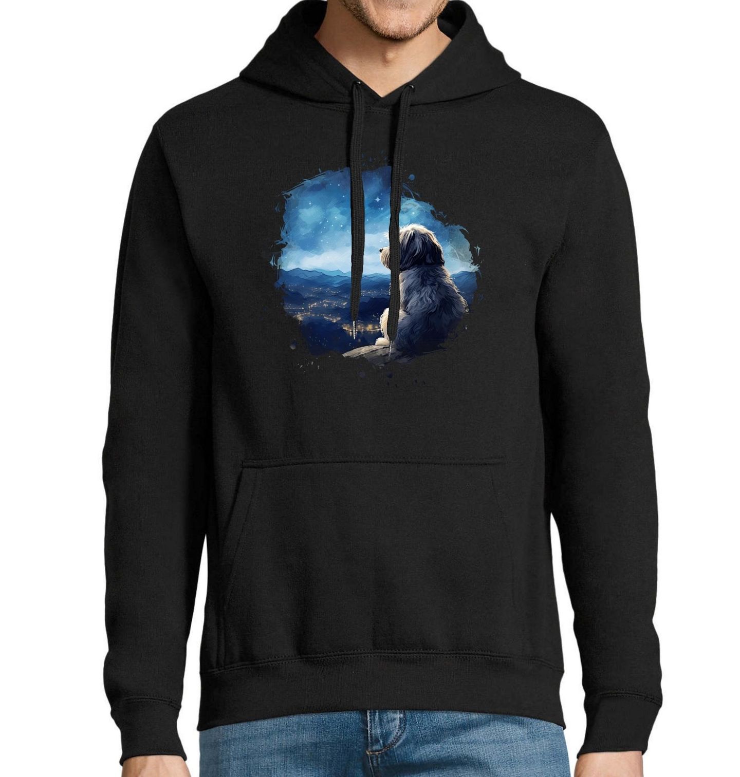 Pánská mikina Noční Hlídač Města Shih-tzu. Tento snový motiv s plemenem Shih-tzu na pozadí noční oblohy nad městem je určen pro každého, kdo ví, že pes je víc než mazlíček – je to přítel, který čeká, hlídá a miluje. Motiv osloví každého pejskaře, který miluje tichou sílu a něhu, jež Shih-tzu ztělesňuje.