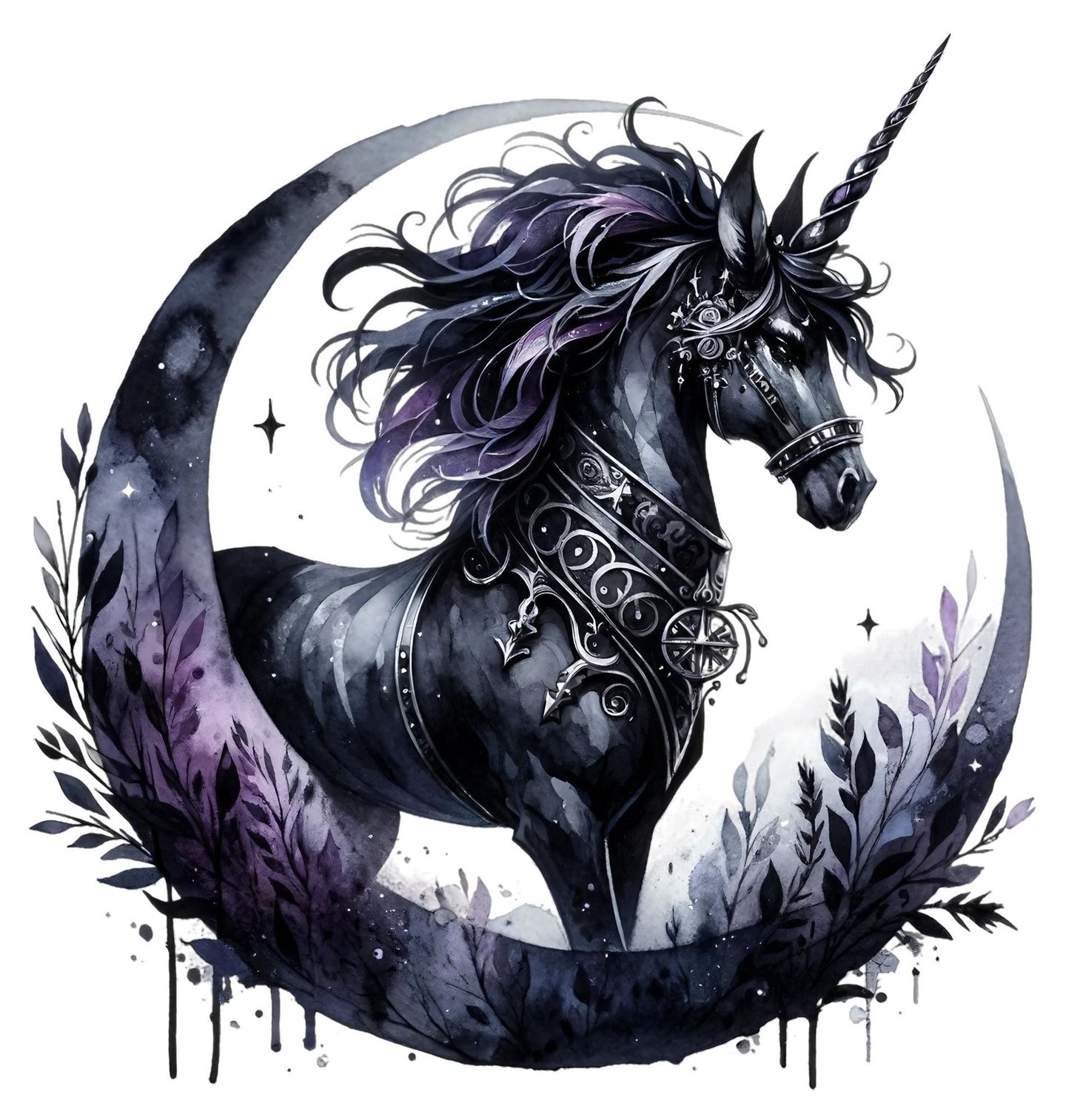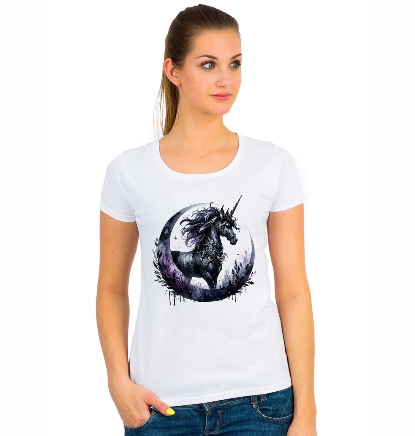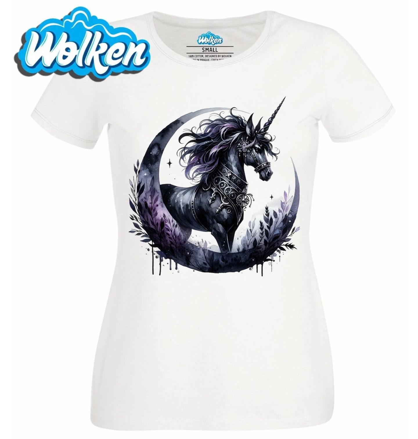 Dámské tričko Noční Jednorožec. Magický jednorožec zobrazuje temně laděného jednorožce zahaleného v mystické záři měsíce. Tento působivý design spojuje sílu elegance s kouzlem fantasy a okouzlí každého milovníka mýtických bytostí. Ideální pro fanoušky fantasy, snílkáře i všechny, kteří věří, že jednorožec je víc než jen pohádkový tvor.