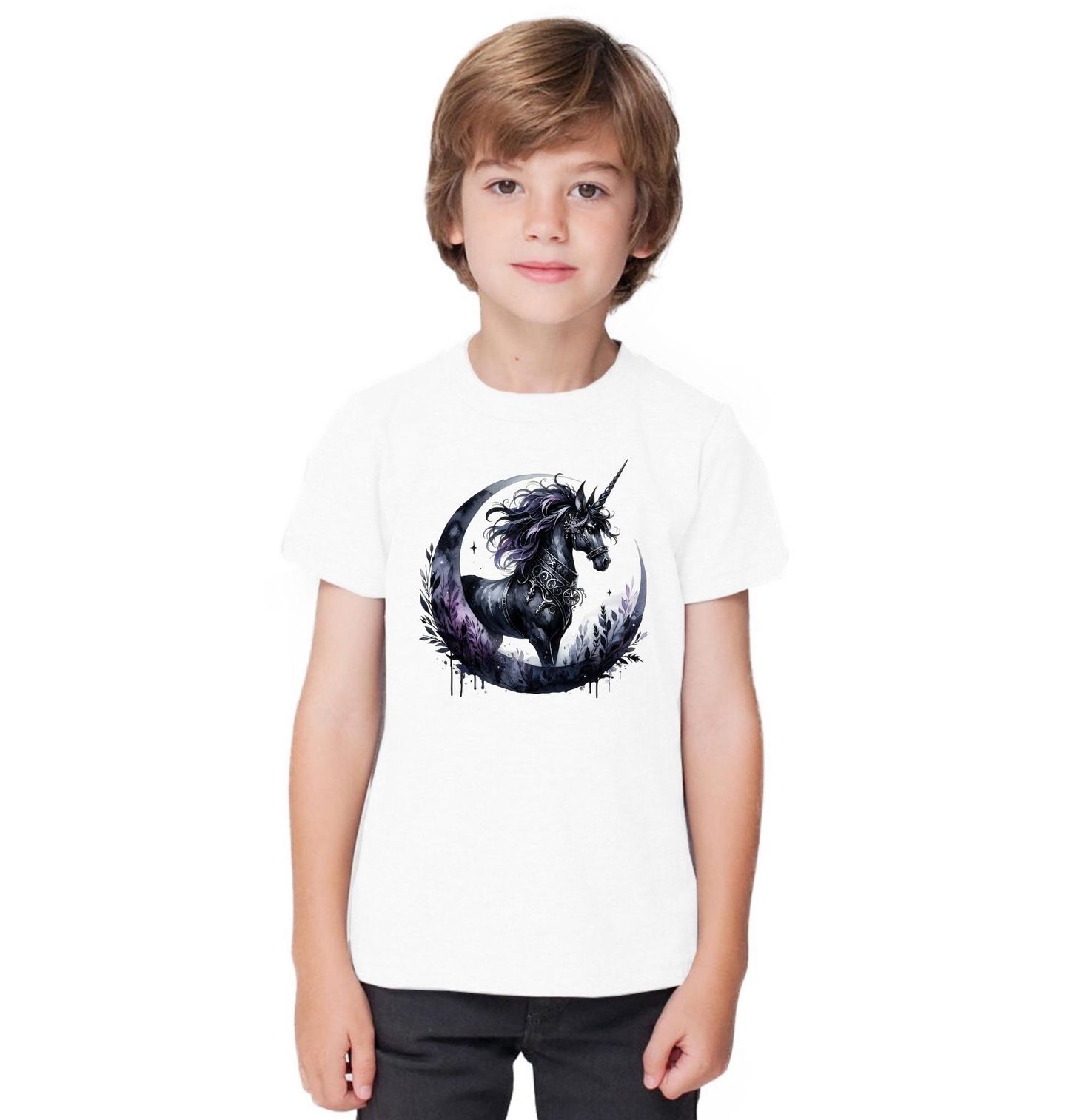 Dětské tričko Noční Jednorožec. Magický jednorožec zobrazuje temně laděného jednorožce zahaleného v mystické záři měsíce. Tento působivý design spojuje sílu elegance s kouzlem fantasy a okouzlí každého milovníka mýtických bytostí. Ideální pro fanoušky fantasy, snílkáře i všechny, kteří věří, že jednorožec je víc než jen pohádkový tvor.