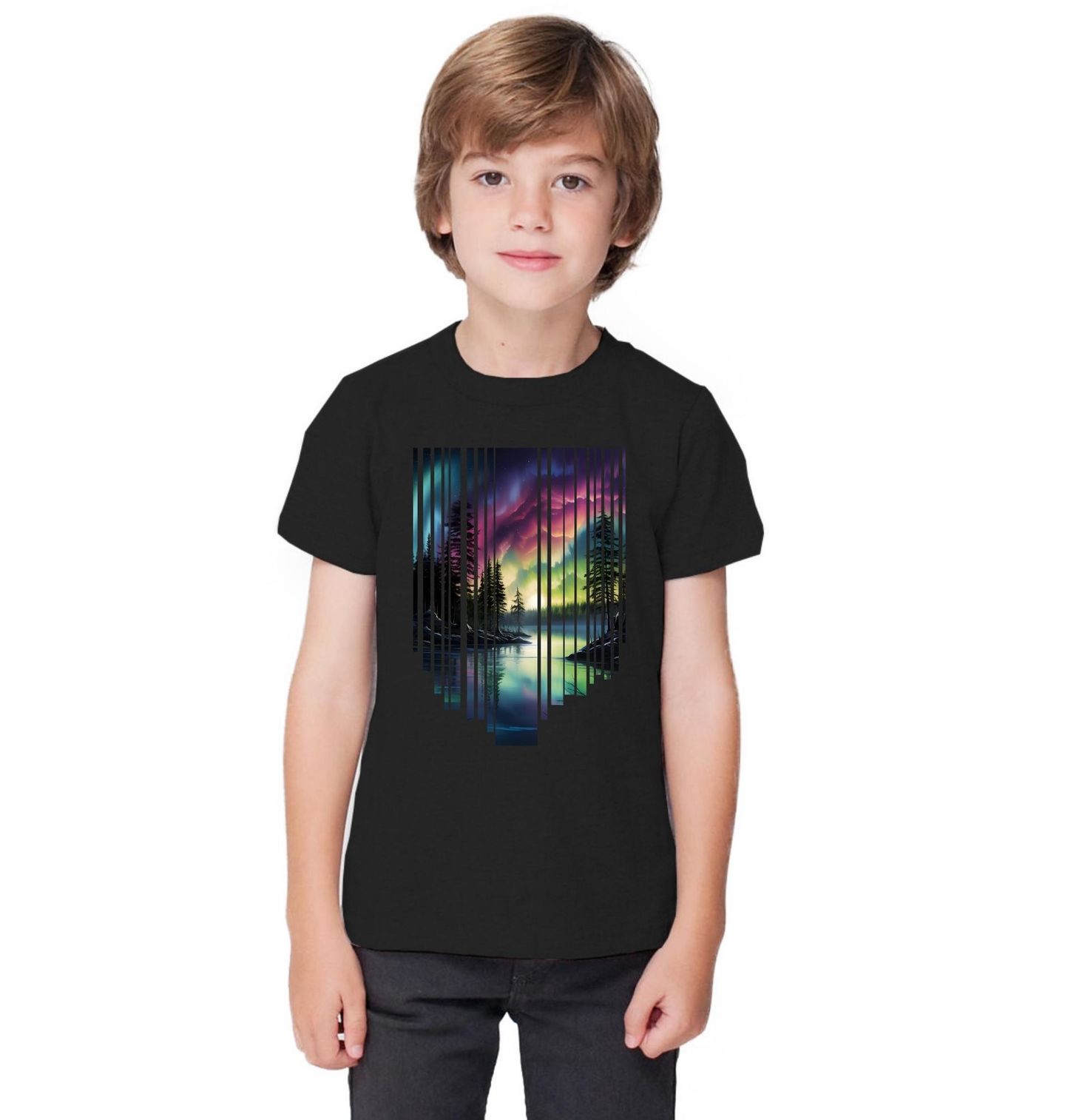 Dětské tričko Noční Jezero pod Polární Září. Tenhle motiv zachycuje klidnou přírodní scenérii, kde je les, tiché jezero a nad nimi se na obloze objevuje barevná polární záře. Stromy se odrážejí ve vodní hladině a celá scéna působí jemně, klidně a trochu magicky.
