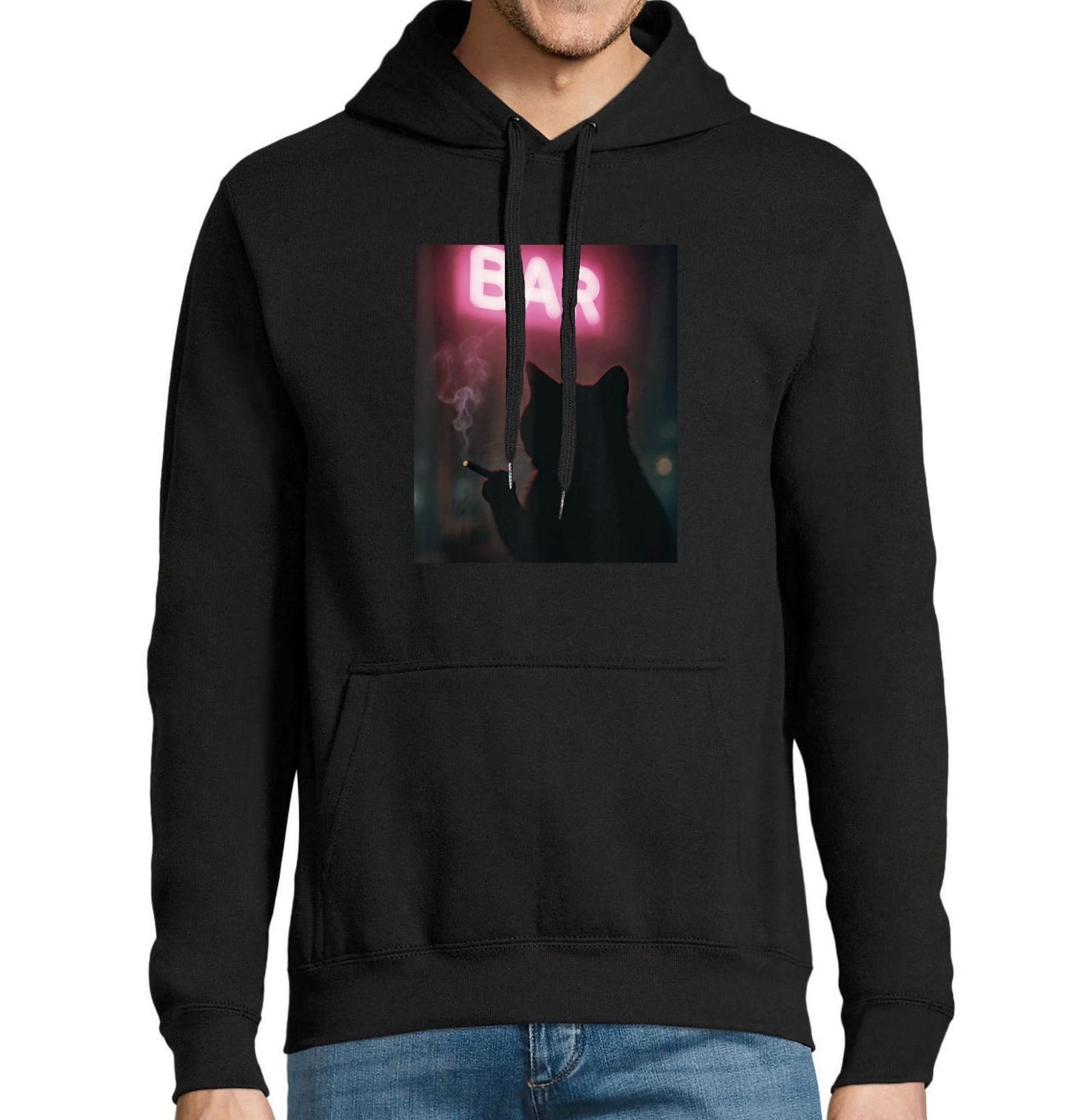 Pánská mikina Noční Kočičí Bar. Stylové tričko s tajemným motivem siluety kočky, která v ruce drží cigaretu a sedí pod neonovým nápisem "BAR". Ideální pro milovníky nočního života, ironie i rebelie. Tento design propojuje motiv kočky, cigarety a baru v temném, lehce film-noir stylu. Tričko je skvělým dárkem pro každého, kdo má slabost pro kočky a párty.
