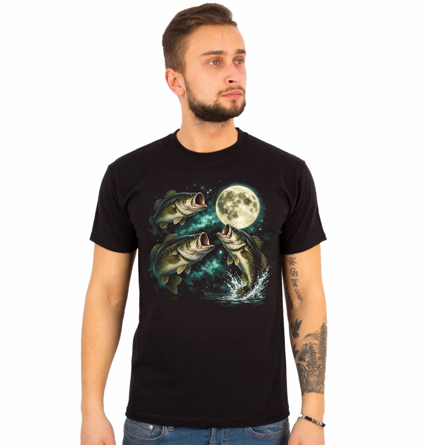 Pánské tričko Noční Lov Ryb. Magická ilustrace zachycuje několik ryb, které plavou a skáčou kolem zářícího úplňku na noční obloze. Celý motiv působí mysticky a připomíná klidnou atmosféru noční vody. Ryba je zde symbolem svobody, života ve vodě a rybářského dobrodružství. Design osloví každého, kdo miluje rybolov, přírodu a krásu noční krajiny.