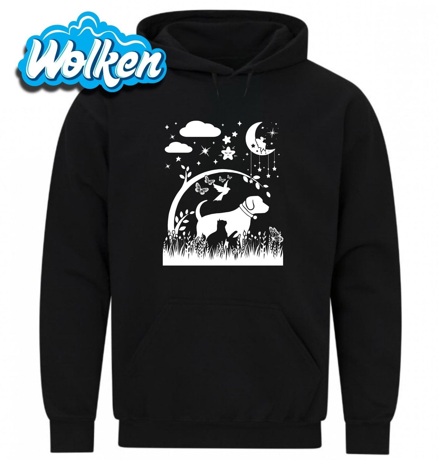 Pánská mikina Noční procházka se zvířaty. V kouzelné noční krajině, kde hvězdy svítí tiše a nad hlavou visí pohádkový měsíc, spolu stojí pes a kočka – bok po boku. Kolem nich poletují motýli, míjí je klidný pták a celý svět na chvíli zpomalí. Toto tričko je o přátelství, míru a tichém spojení mezi zvířaty a nočním nebem.