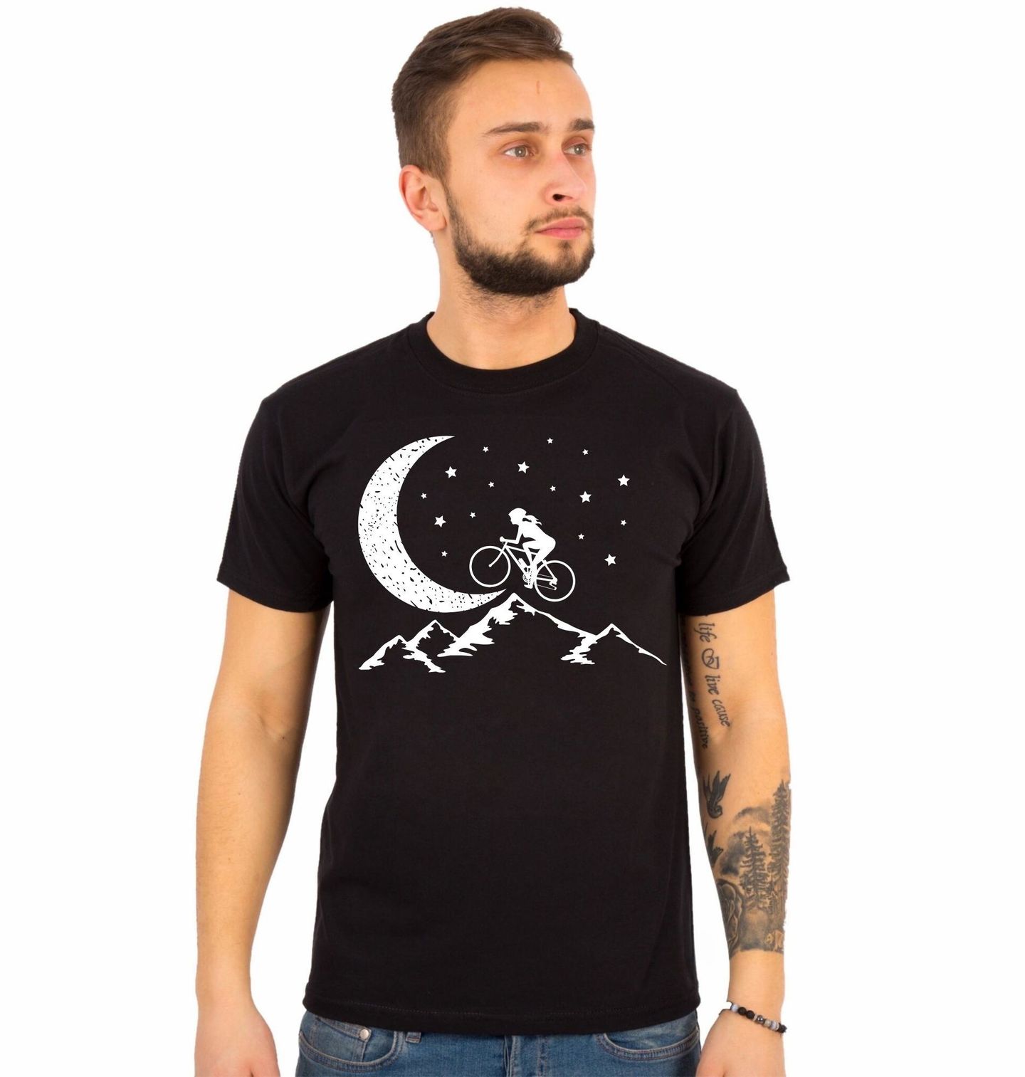 Pánské tričko Noční Projížďka na Kole. Jedinečný motiv zachycuje kouzelnou scénu, kde cyklistika ožívá pod hvězdnou oblohou. Jezdec na kole projíždí horskou krajinou a míří přímo k tajemnému měsíci, který dodává celému designu snovou atmosféru. Tento motiv spojuje vášeň pro cyklistika s láskou k přírodě a nočním dobrodružstvím.