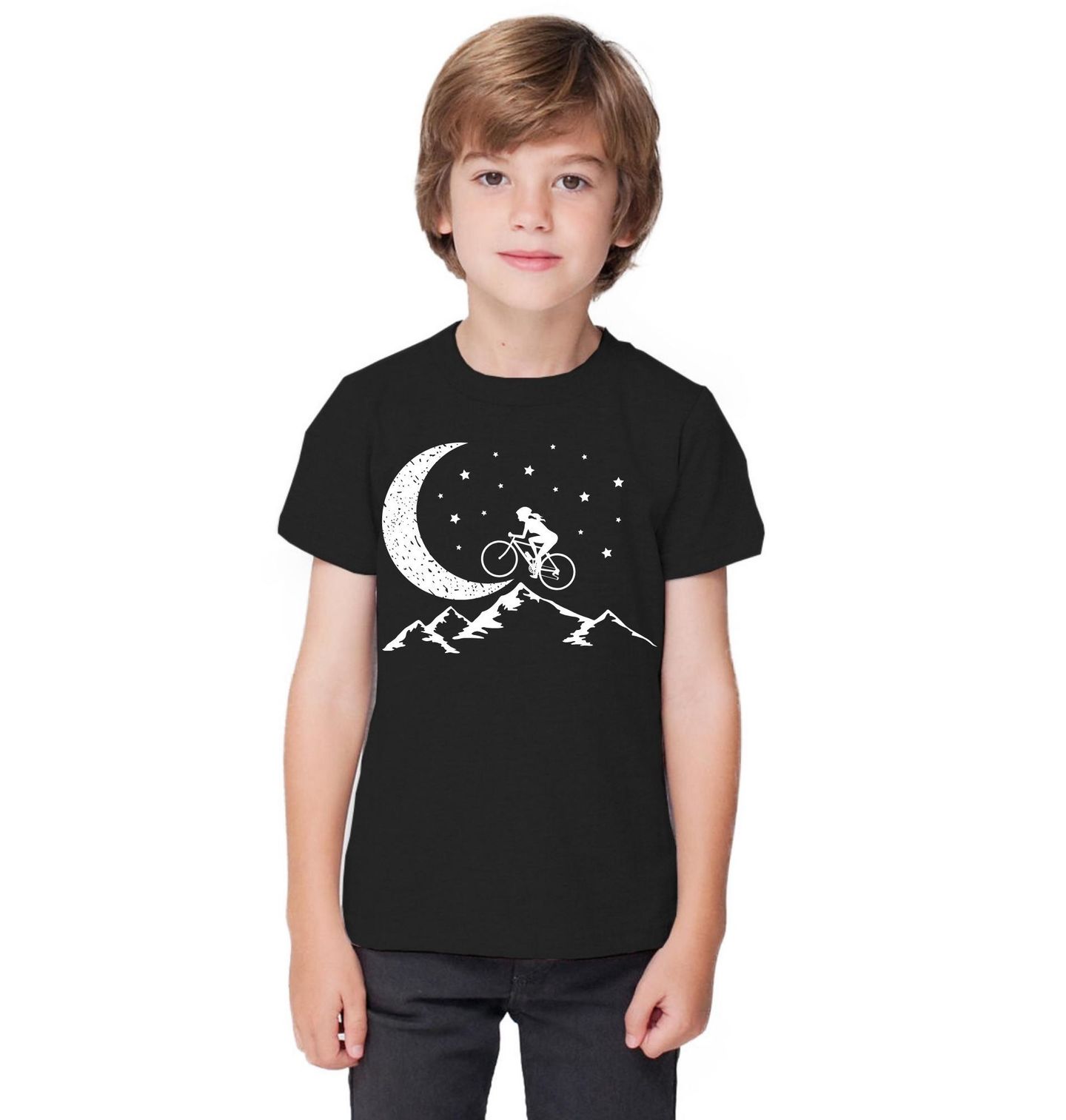 Dětské tričko Noční Projížďka na Kole. Jedinečný motiv zachycuje kouzelnou scénu, kde cyklistika ožívá pod hvězdnou oblohou. Jezdec na kole projíždí horskou krajinou a míří přímo k tajemnému měsíci, který dodává celému designu snovou atmosféru. Tento motiv spojuje vášeň pro cyklistika s láskou k přírodě a nočním dobrodružstvím.