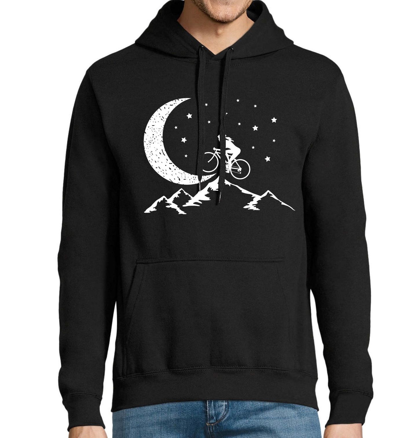 Pánská mikina Noční Projížďka na Kole. Jedinečný motiv zachycuje kouzelnou scénu, kde cyklistika ožívá pod hvězdnou oblohou. Jezdec na kole projíždí horskou krajinou a míří přímo k tajemnému měsíci, který dodává celému designu snovou atmosféru. Tento motiv spojuje vášeň pro cyklistika s láskou k přírodě a nočním dobrodružstvím.