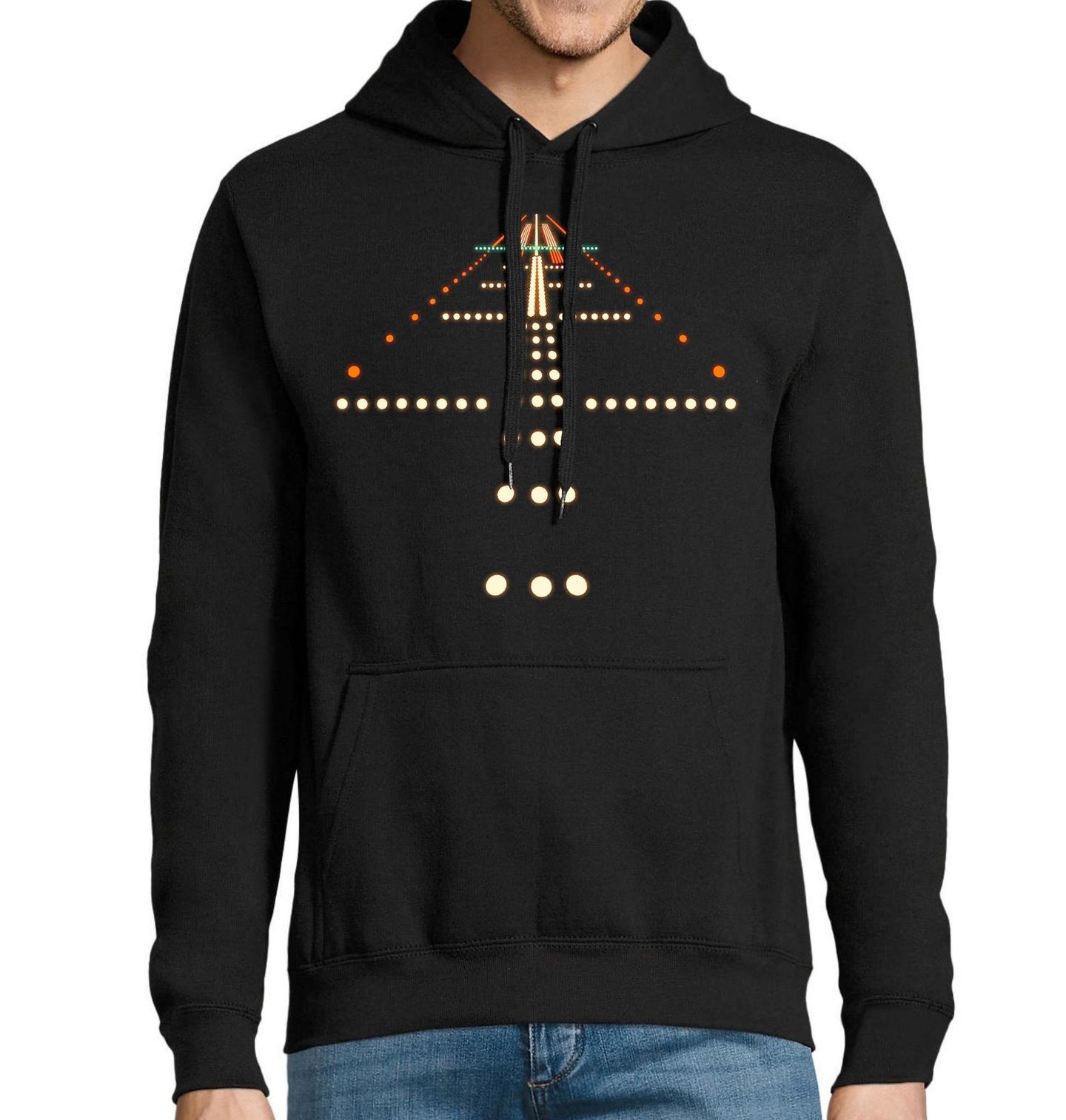 Pánská mikina Noční Ranvej. Atmosférický motiv přistávací dráhy zachycuje světla ranveje při nočním přistání. Vzletová a přistávací dráha je plocha sloužící ke vzletům a přistáním letadel na letištích. Tento čistý vizuál ocení každý fanoušek letectví.