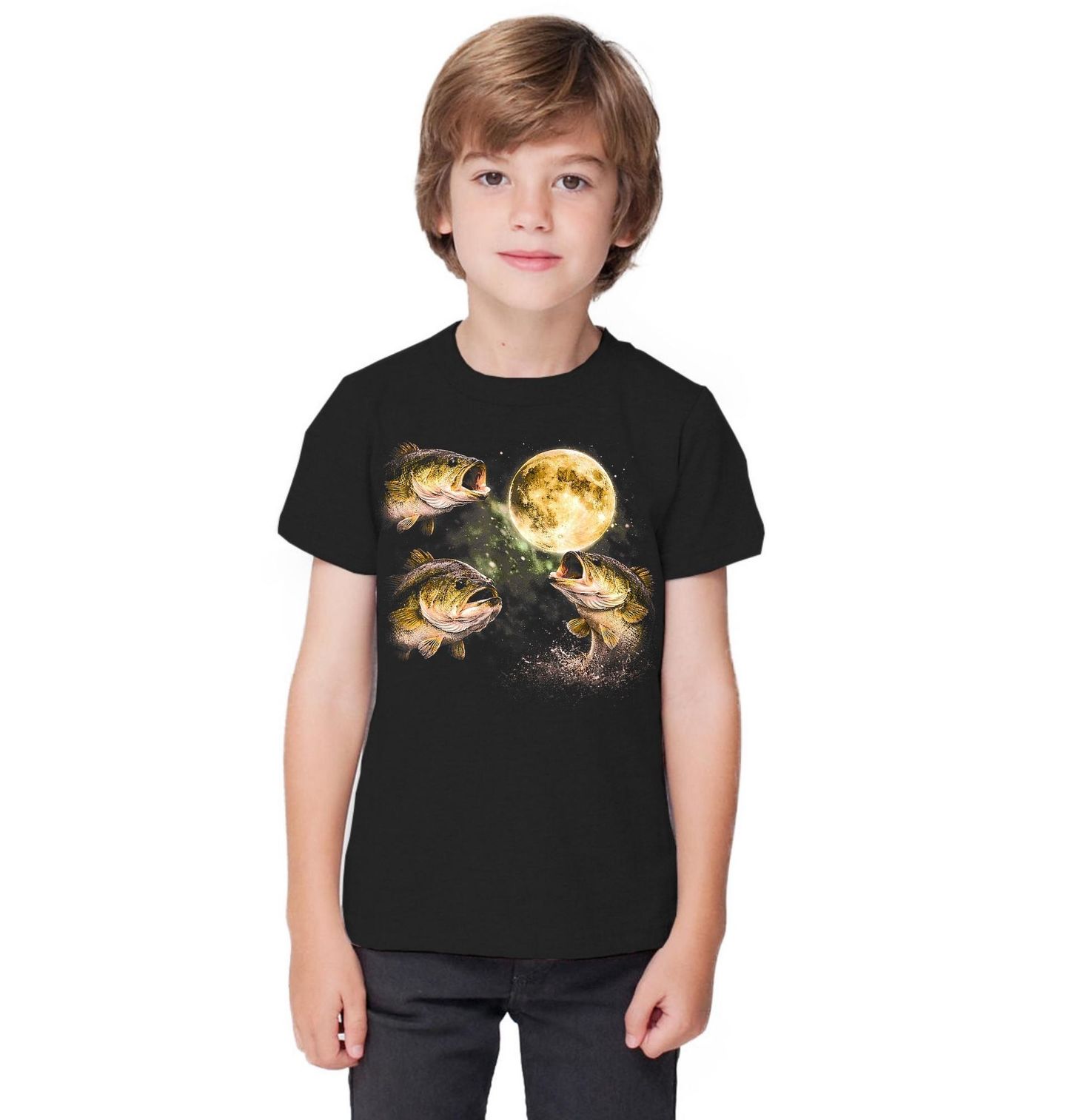 Dětské tričko Noční Rybí Kruh. Magická ilustrace zachycuje několik ryb, které plavou a skáčou kolem zářícího úplňku na noční obloze. Celý motiv působí mysticky a připomíná klidnou atmosféru noční vody. Ryba je zde symbolem svobody, života ve vodě a rybářského dobrodružství. Design osloví každého, kdo miluje rybolov okounů, přírodu a krásu noční krajiny.