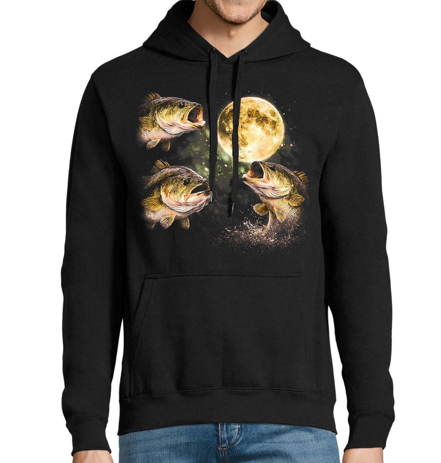Pánská mikina Noční Rybí Kruh. Magická ilustrace zachycuje několik ryb, které plavou a skáčou kolem zářícího úplňku na noční obloze. Celý motiv působí mysticky a připomíná klidnou atmosféru noční vody. Ryba je zde symbolem svobody, života ve vodě a rybářského dobrodružství. Design osloví každého, kdo miluje rybolov okounů, přírodu a krásu noční krajiny.