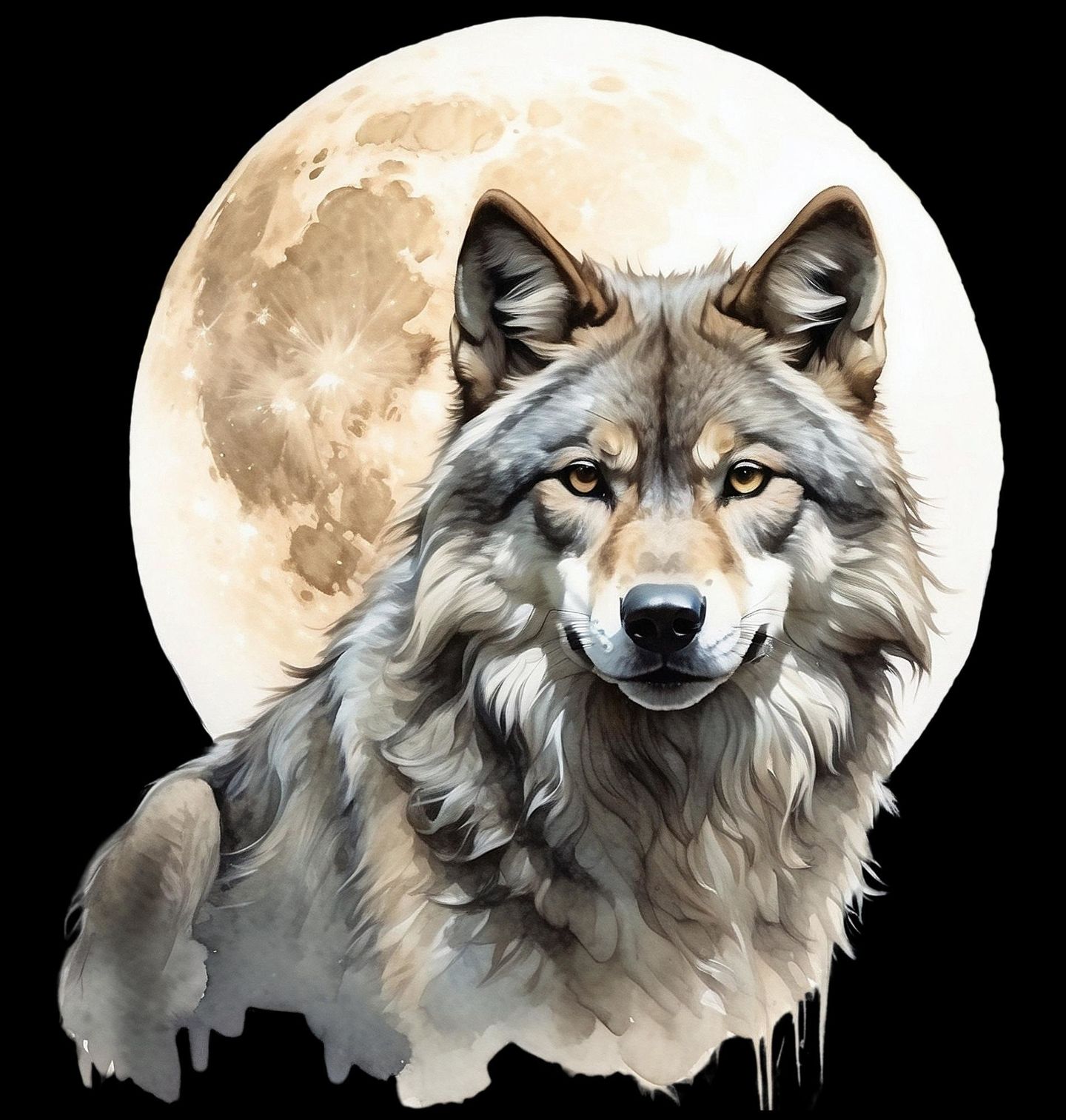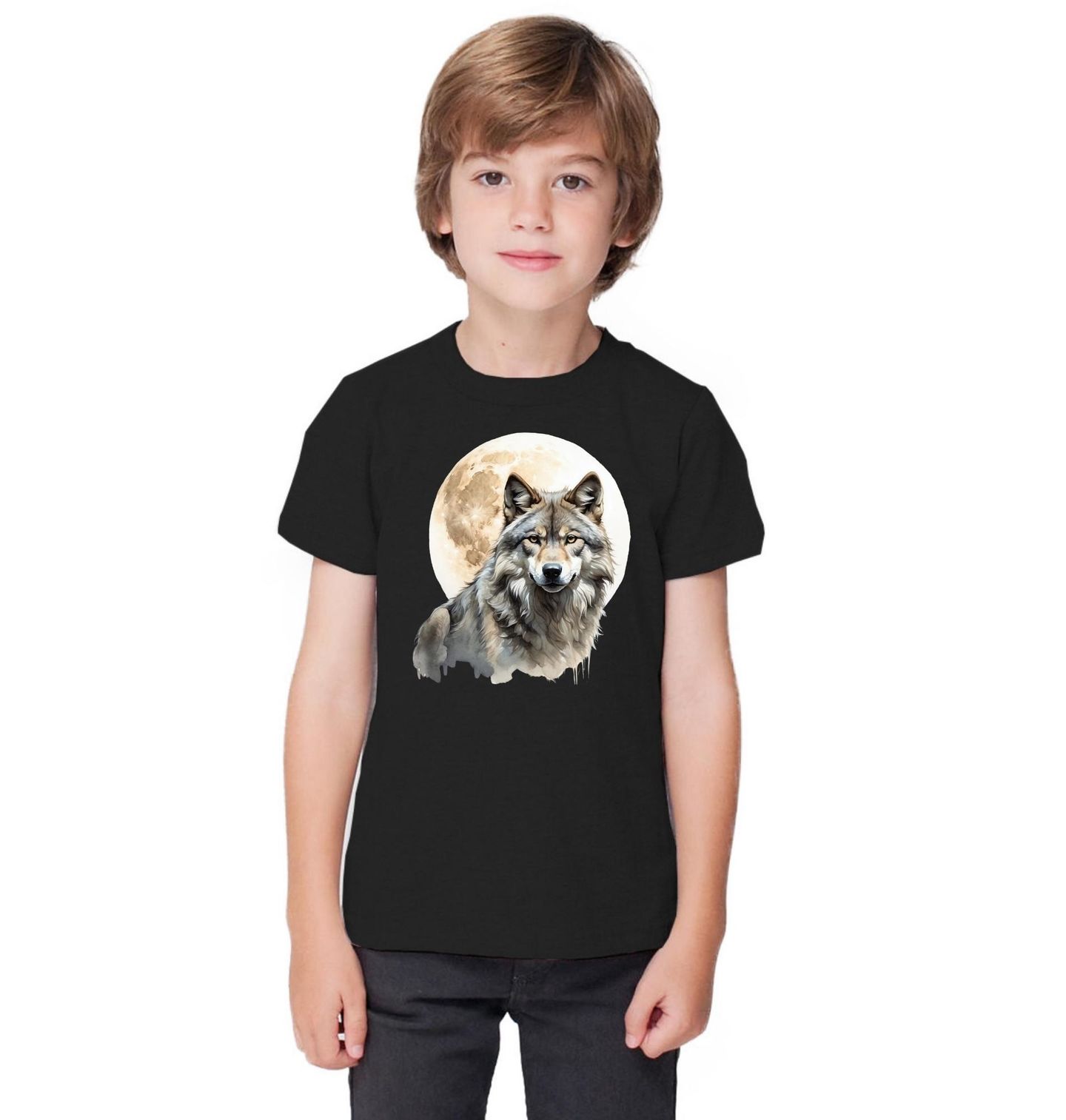 Dětské tričko Noční Vlk. Majestátní vlk zachycený před zářícím měsícem symbolizuje svobodu, sílu a instinkt. Motiv propojuje divokou přírodu s tajemnou noční atmosférou, kde vlk představuje nespoutaného ducha. I když nejde o domestikovaného psa, pes v nás stále nese část této divokosti.