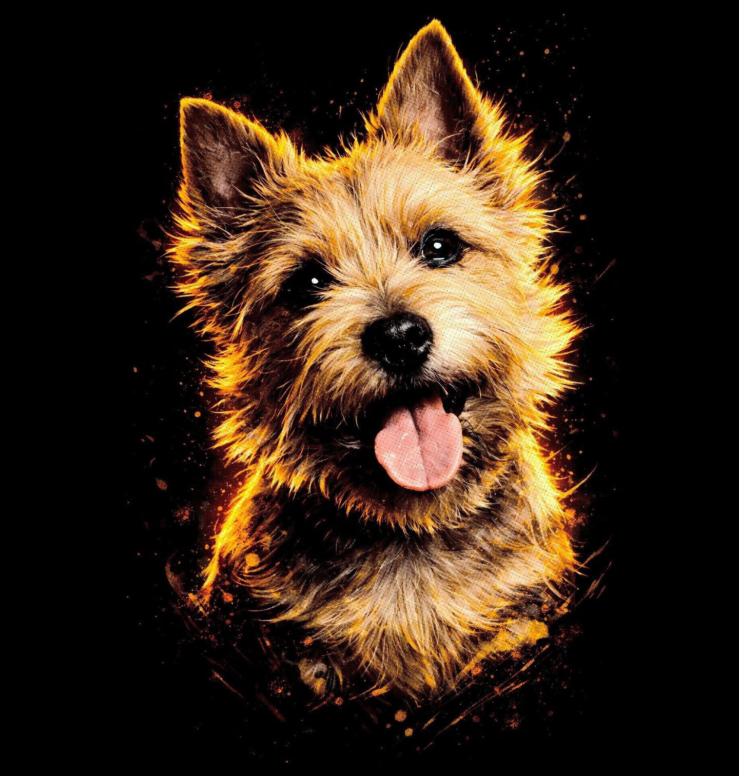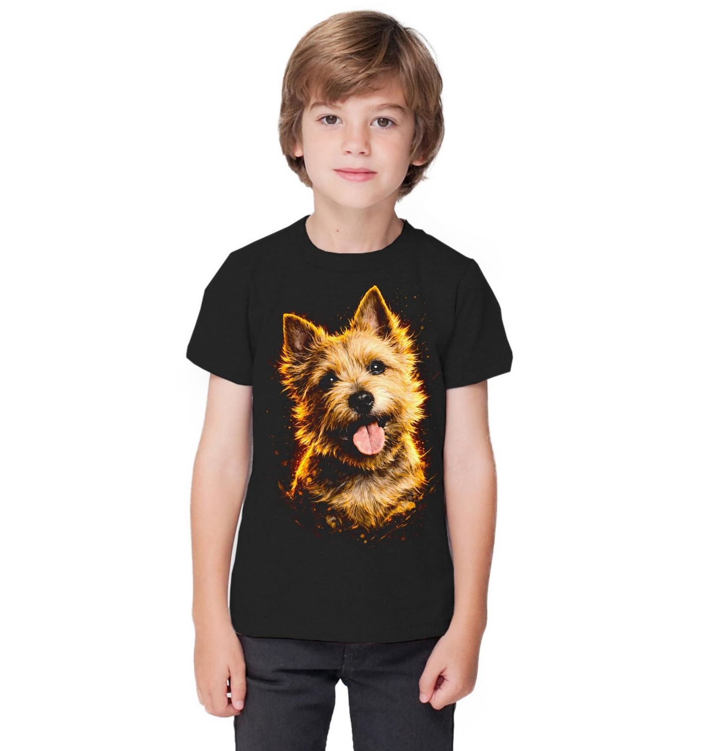 Dětské tričko Norwich teriér. Tento originální motiv zachycuje roztomilého psa plemene Norwich teriér v zářivém, energickém stylu s teplými odstíny, které podtrhují jeho živou a přátelskou povahu. Detailní ilustrace vystihuje typickou drsnou srst, vztyčené uši a radostný výraz, díky kterému je tento pes tak oblíbený mezi milovníky psů. Ideální volba pro každého pejskaře, který chce vyjádřit svou lásku ke svému čtyřnohému parťákovi originálním a stylovým způsobem. T
