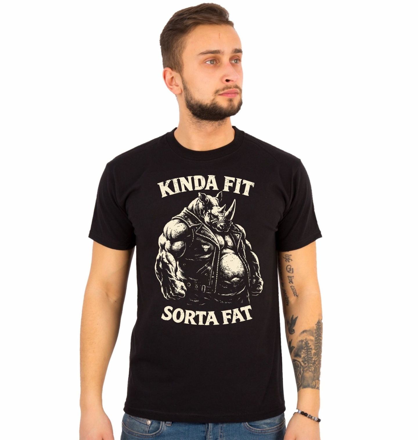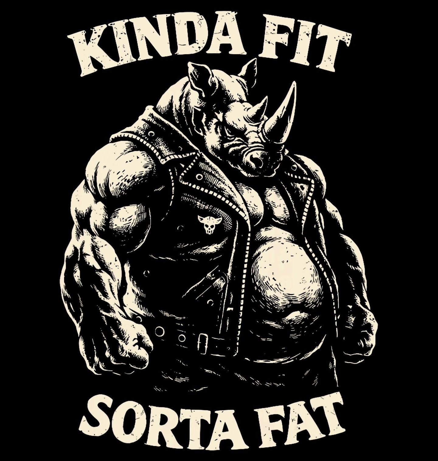Pánské tričko Nosorožec Fit Trochu Jinak. Stylový design s mohutným nosorožcem a textem „Kinda Fit Sorta Fat“ (Tak trochu fit, tak trochu při těle) přináší humor i sebevědomí. Kombinuje drsný vzhled s nadsázkou a ukazuje, že síla má mnoho podob. Tento design je ideální pro ty, kteří berou fitness s lehkostí a humorem.