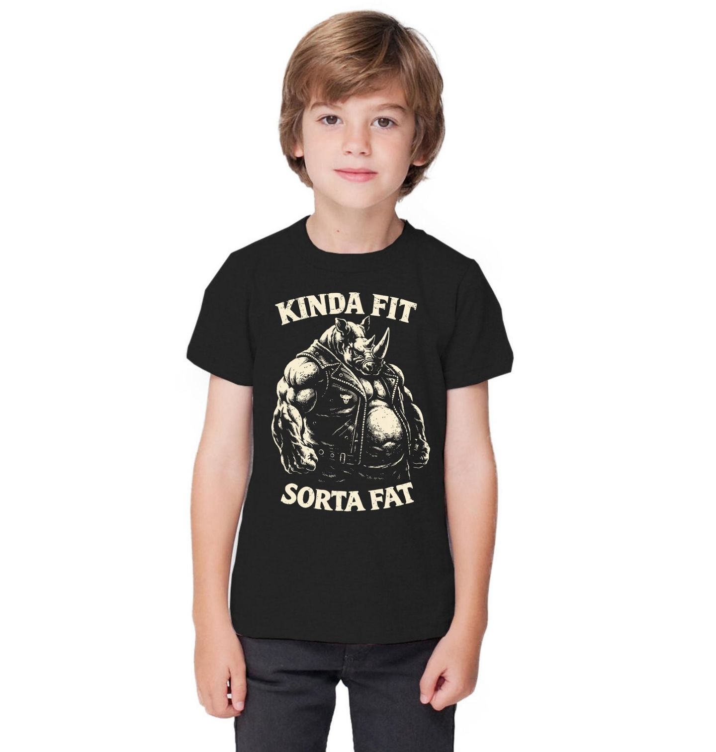 Dětské tričko Nosorožec Fit Trochu Jinak. Stylový design s mohutným nosorožcem a textem „Kinda Fit Sorta Fat“ (Tak trochu fit, tak trochu při těle) přináší humor i sebevědomí. Kombinuje drsný vzhled s nadsázkou a ukazuje, že síla má mnoho podob. Tento design je ideální pro ty, kteří berou fitness s lehkostí a humorem.