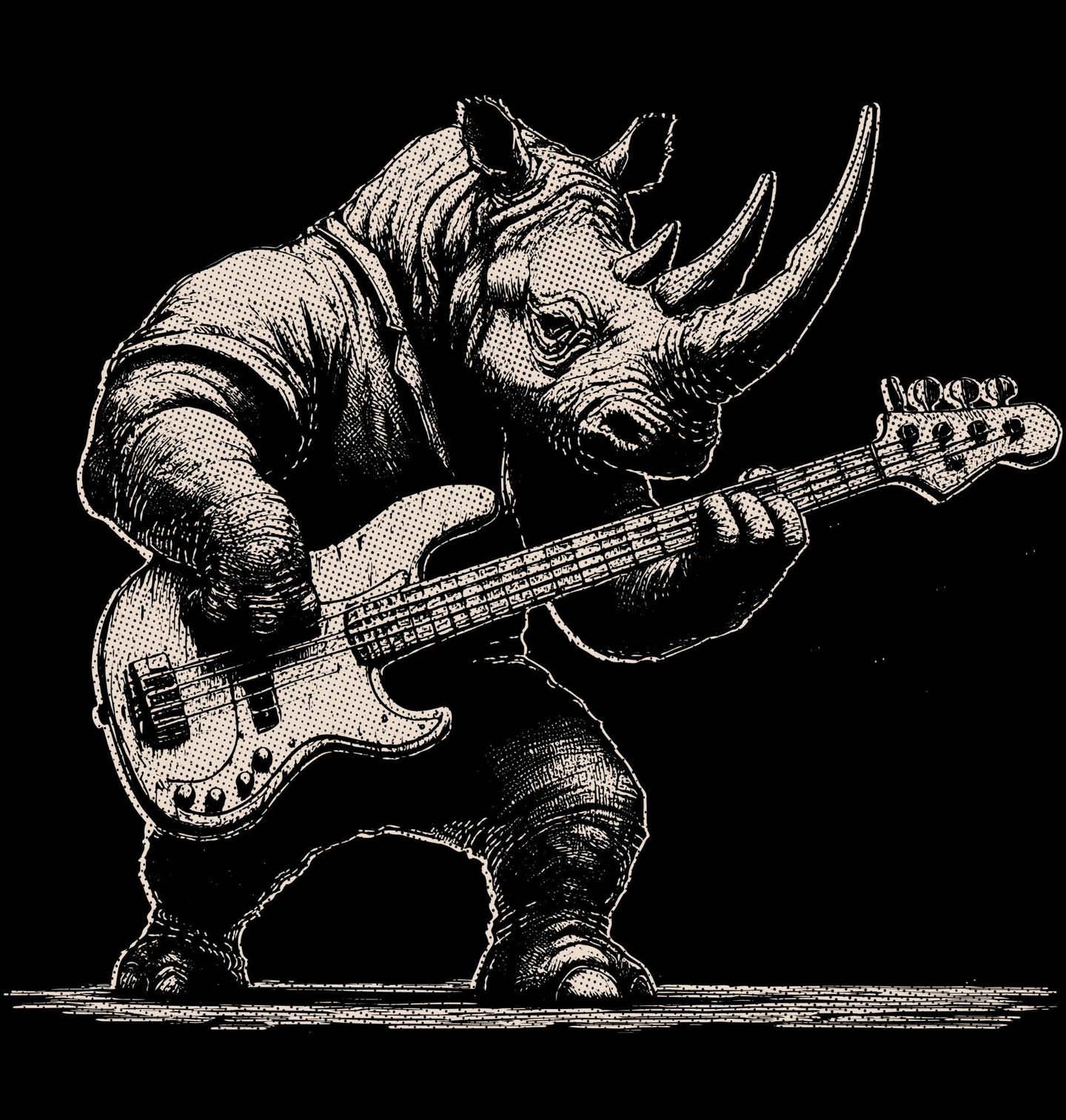 Dámské tričko Nosorožec s Kytarou. Když se spojí kytara a nosorožec, vznikne výbušná kombinace síly, hudby a nespoutané energie. Tento motiv zobrazuje mohutného nosorožce, jak drtí riffy na elektrickou kytaru – stylově, drsně a s nekompromisním výrazem.