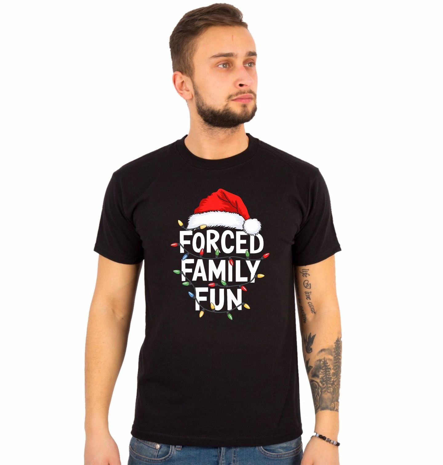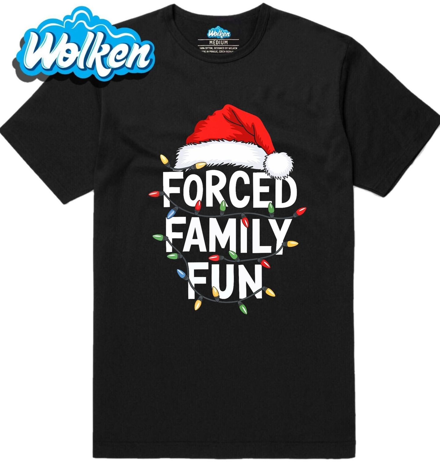 Pánské tričko Nucená Vánoční Rodinná Zábava. Vtipný motiv „Forced Family Fun“ (v překladu nucená rodinná zábava) perfektně vystihuje realitu, kterou někdy přináší Vánoce. Santovská čepice a barevné vánoční světýlka dodávají ilustraci sváteční atmosféru, i když text mluví jasně – rodinné chvíle o svátcích bývají někdy povinným programem.