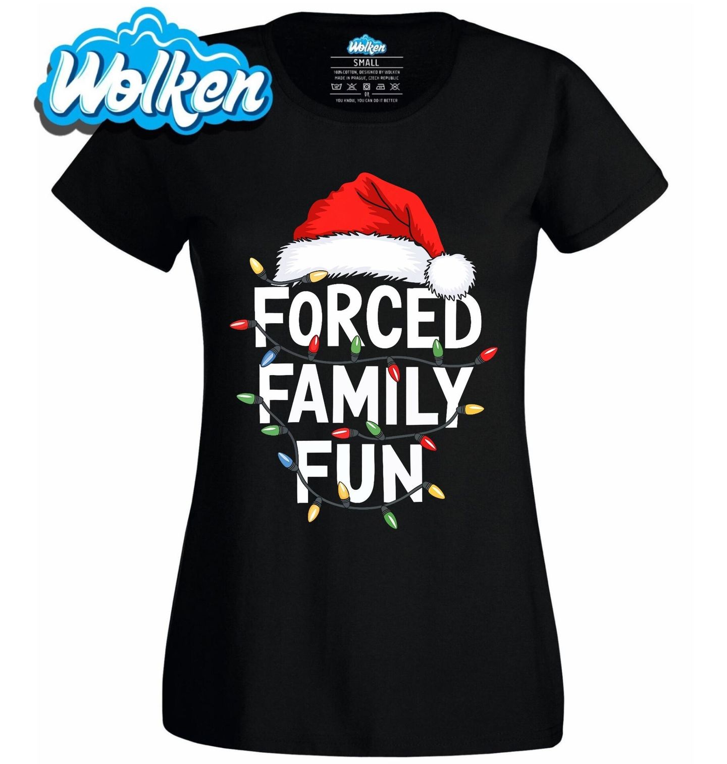 Dámské tričko Nucená Vánoční Rodinná Zábava. Vtipný motiv „Forced Family Fun“ (v překladu nucená rodinná zábava) perfektně vystihuje realitu, kterou někdy přináší Vánoce. Santovská čepice a barevné vánoční světýlka dodávají ilustraci sváteční atmosféru, i když text mluví jasně – rodinné chvíle o svátcích bývají někdy povinným programem.