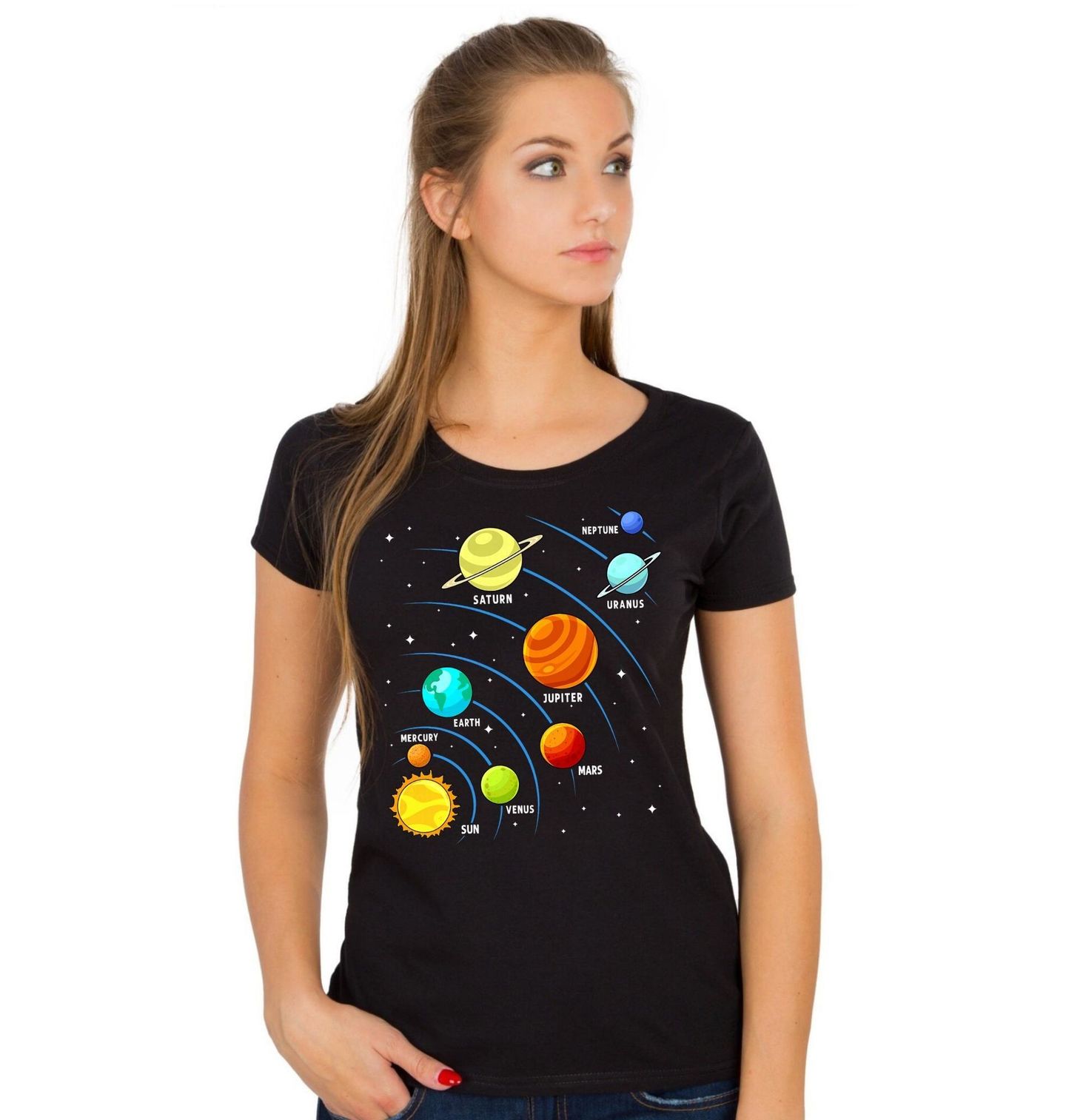 Dámské tričko Oběžné Dráhy Planet. Design znázorňuje planety a jejich oběžné dráhy (orbit) kolem Slunce. Ideální pro fanoušky fyziky a astronomie. Skvělý motiv pro každého, kdo miluje vesmír a sluneční soustavu.