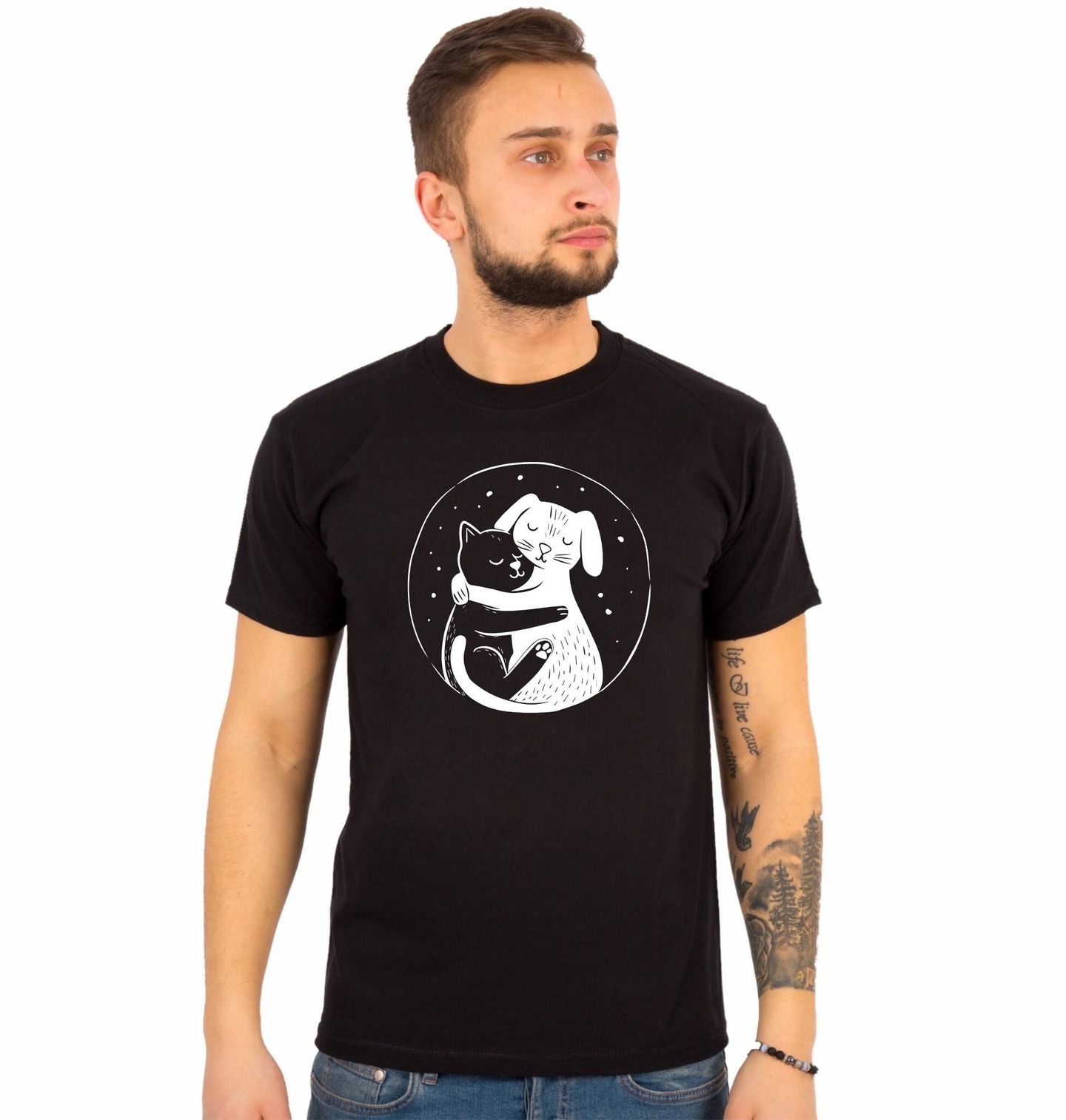 Pánské tričko Objetí Kočky a Psa. Krásný černobílý motiv, na kterém se něžně objímá kočka a pes. Ilustrace vyzařuje klid, harmonii a přátelství – ideální pro všechny milovníky zvířat. Jednoduchý, ale silný design připomíná, že kočka a pes mohou být ti nejlepší parťáci. Perfektní dárek pro každého pejskaře.