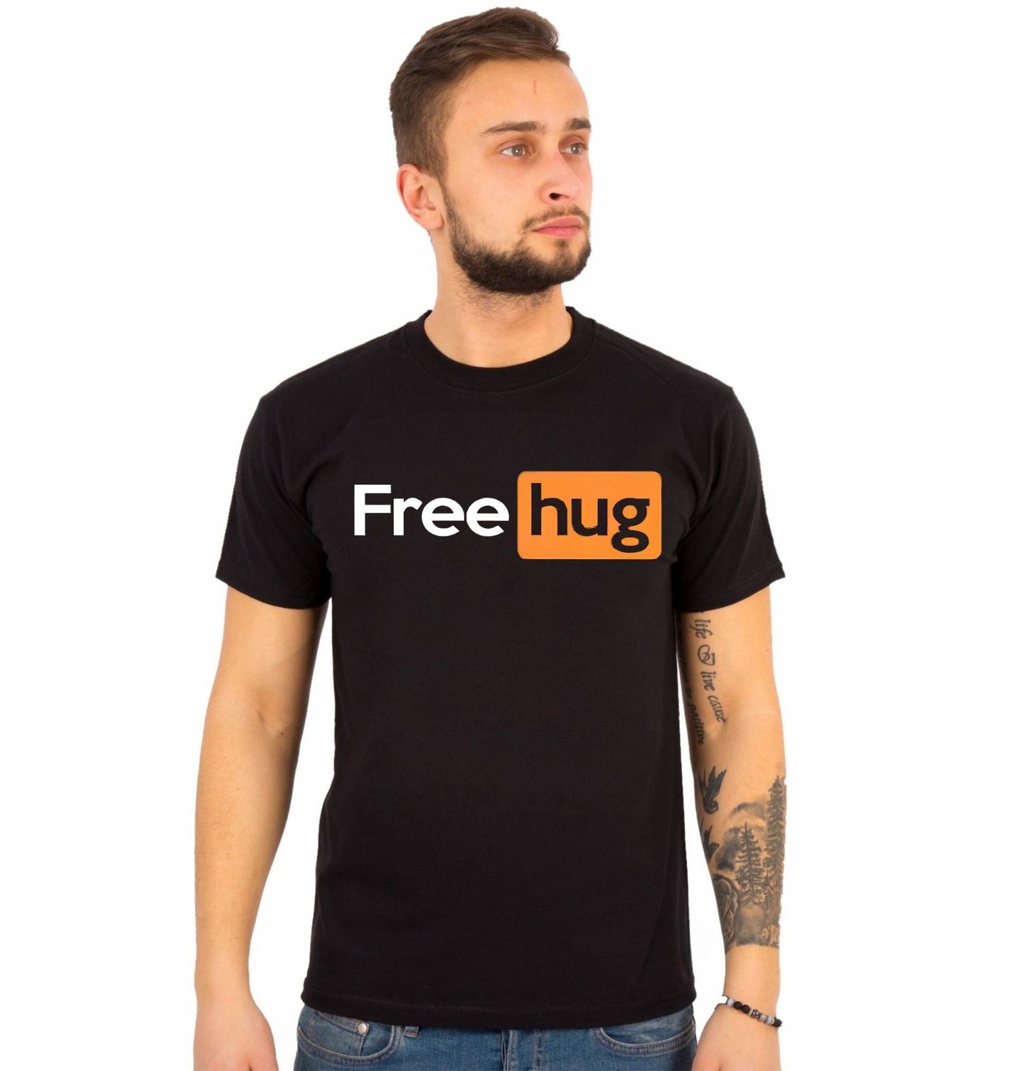 Pánské tričko Objetí Zdarma Free Hug Pornhub. Tento potisk využívá světově známou grafiku populárního webu pro dospělé, ale mění její kontext na něco překvapivě nevinného. Spojení nápisu „Free hug“ s oranžovo-černým vizuálem vytváří úderný kontrast, který si okamžitě získá pozornost díky své drzé nadsázce. Je to minimalistický, ale díky barevné kombinaci velmi výrazný design, který těží z popkulturního povědomí a smyslu pro ironii.