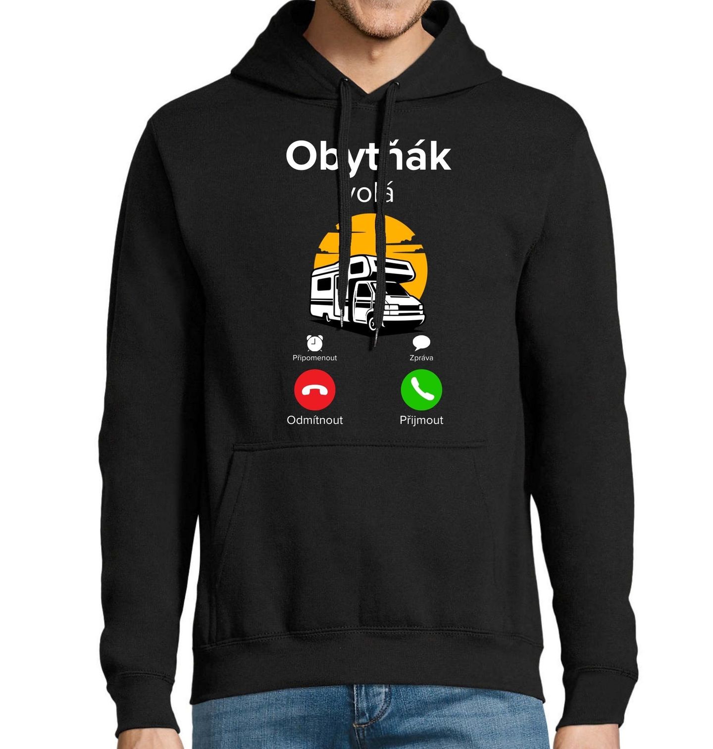 Pánská mikina Obytňák volá Phone Call. Originální motiv pro všechny milovníky dobrodružství, kterým je blízké cestování bez hranic. Stylová grafika s motivem obytného vozu připomíná příchozí hovor a jasně říká, že karavan už čeká na další výpravu. Tento motiv spojuje humor i vášeň pro cestování a je perfektní volbou pro fanoušky roadtripů, kempování i dlouhých výletů.