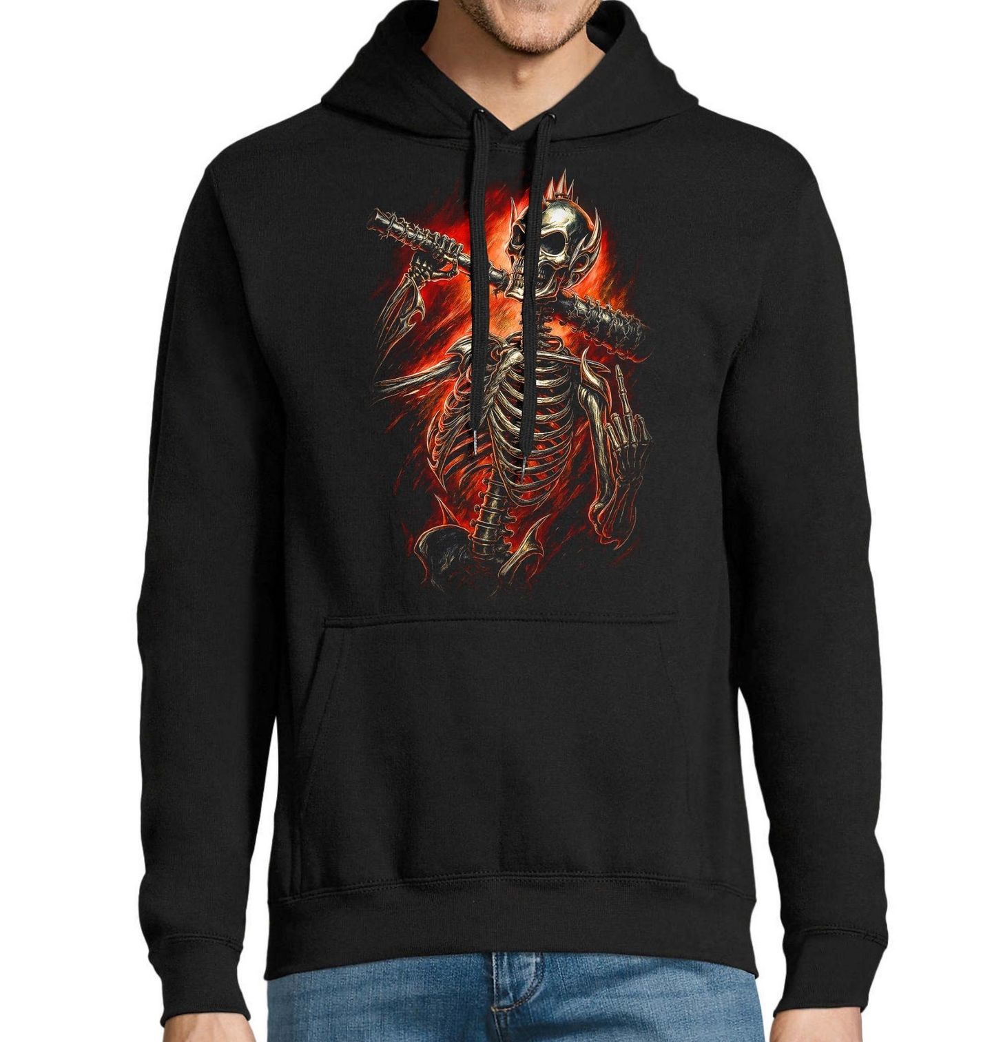 Pánská mikina Ocelový Rebel Bez Respektu. Drsný a provokativní motiv, kde kostlivec vystupuje jako nekompromisní rebel, který se nebojí ukázat svůj postoj světu. S ostny na lebce, zbraní přes ramena a jasným gestem prostředníček vyjadřuje vzdor, svobodu a absolutní nezávislost. Tento kostlivec není jen symbolem smrti, ale i životního stylu bez pravidel a hranic.