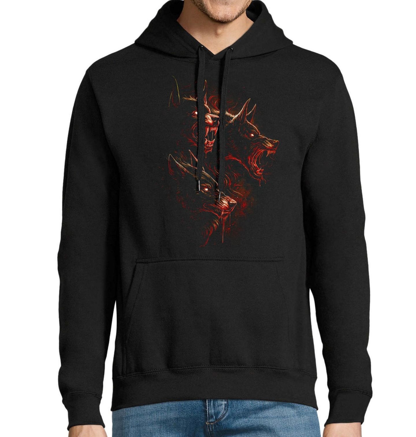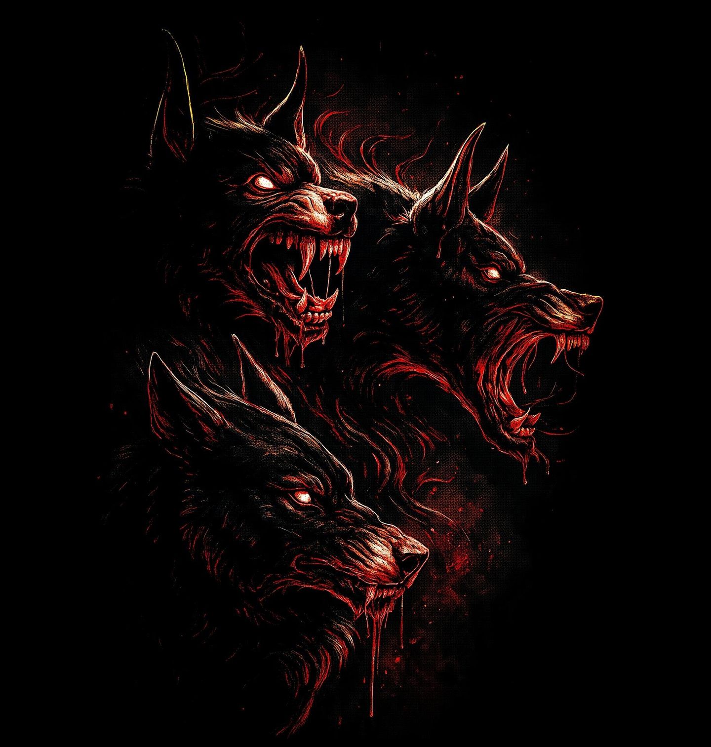 Pánská mikina Oddaný Pes Kerberos. Kerberos (často psáno jako Cerberus) je především v řecké mytologii trojhlavý pes střežící vchod do podsvětí (Hades), který zabraňuje duším uniknout. Detailní zpracování zvýrazňuje agresivní výraz, ostré tesáky a planoucí pohled, který dělá z této bytosti symbol absolutní ochrany a temné moci. Kerberos není jen mýtus – je to zosobnění strachu, kontroly a hranice mezi světy.