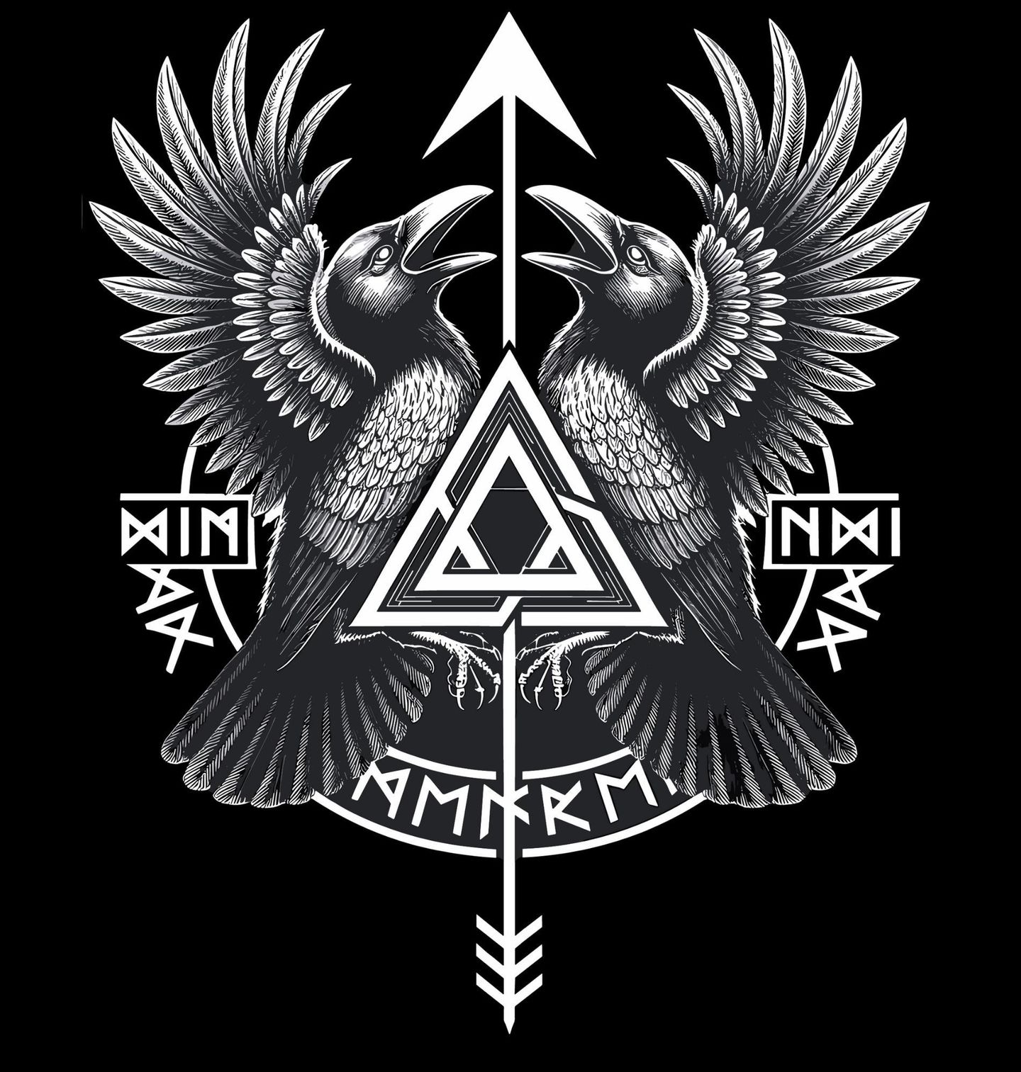 Pánské tričko Odinovi Krkavci Hugin a Munin. Hugin a Munin jsou dva krkavci zasvěcení severskému bohu Ódinovi. Jejich jména znamenají Myšlenka a Paměť. Obletují svět a přinášejí bohu Odinovi zprávy o všem, co se děje. Runový kruh, šíp a valknut v centru podtrhují sílu severské víry a bojového ducha.