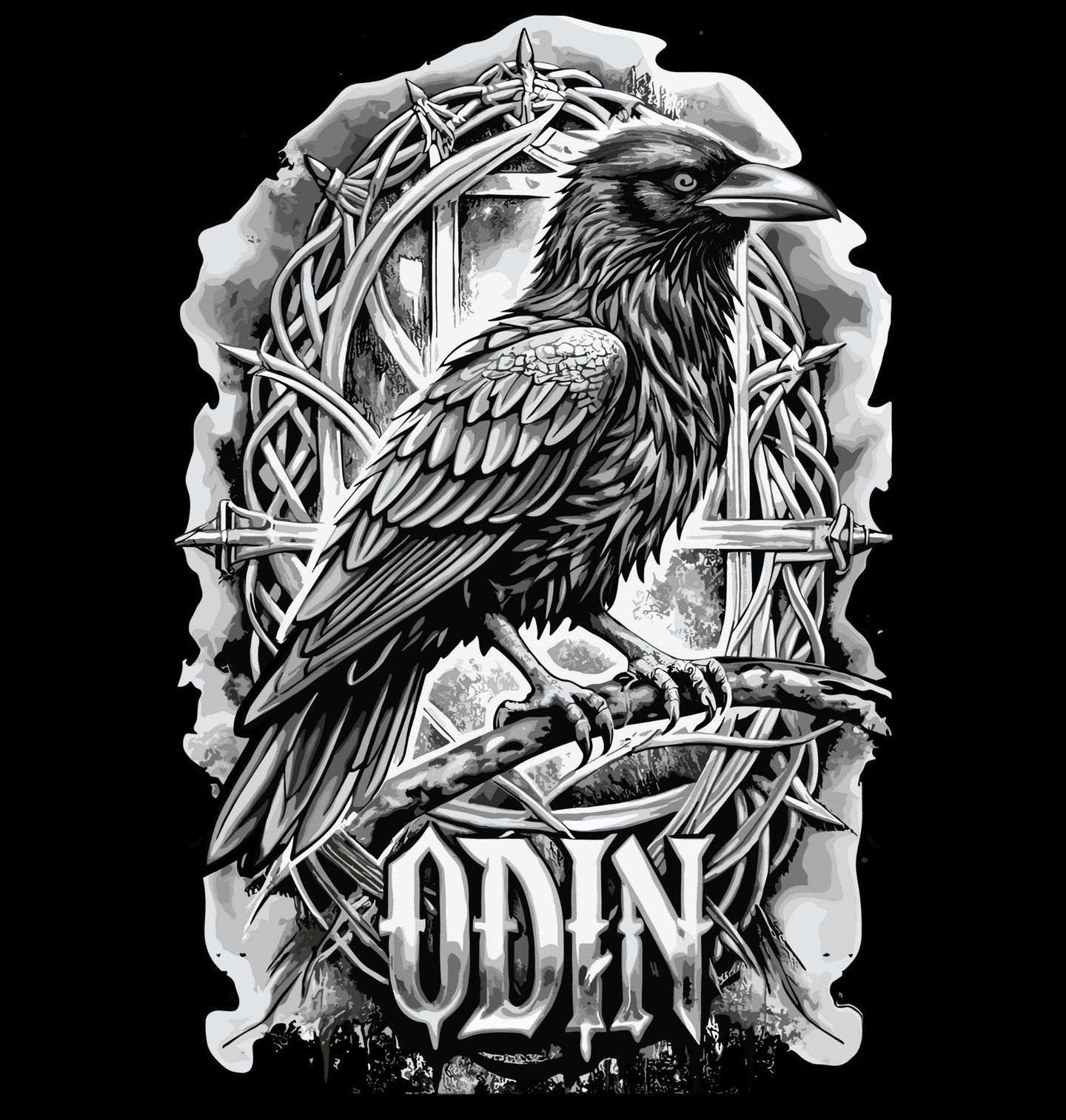 Pánské tričko Odinův Krkavec ODIN. Temný vikingský motiv zobrazuje Odinova krkavce – posvátného ptáka boha Ódina, symbol moudrosti, paměti a poznání. Krkavec sedící před křížem propleteným trny a uzly představuje spojení života, smrti a osudu, které bylo v severské mytologii zásadní.