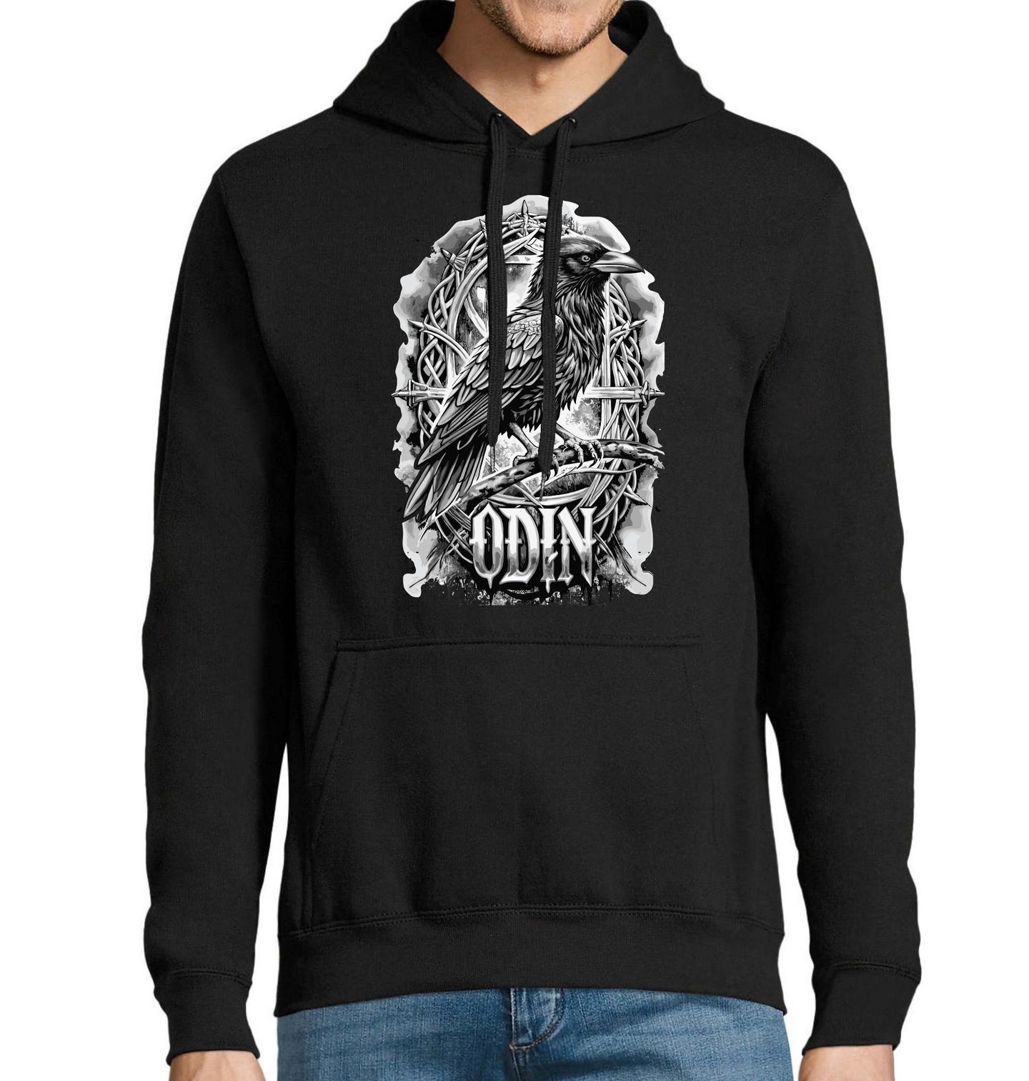 Pánská mikina Odinův Krkavec ODIN. Temný vikingský motiv zobrazuje Odinova krkavce – posvátného ptáka boha Ódina, symbol moudrosti, paměti a poznání. Krkavec sedící před křížem propleteným trny a uzly představuje spojení života, smrti a osudu, které bylo v severské mytologii zásadní.