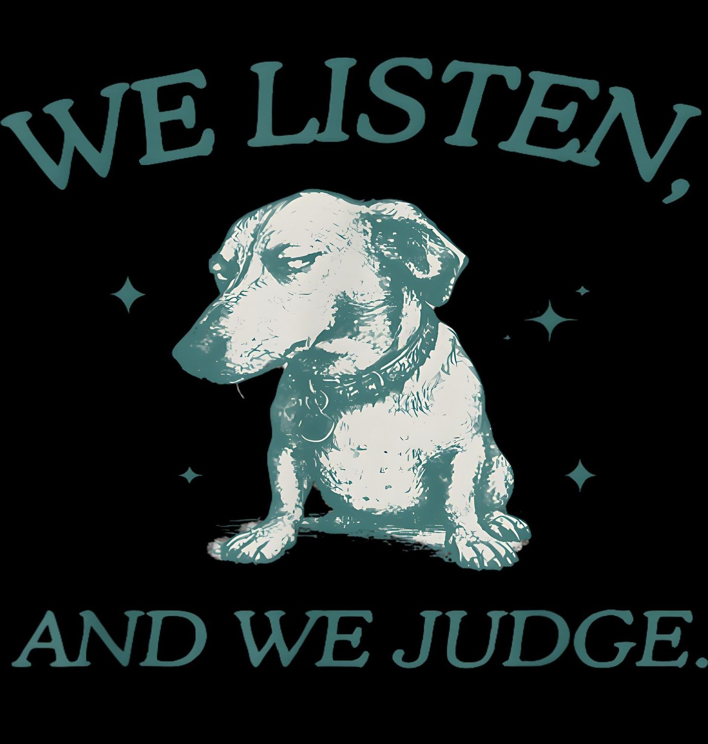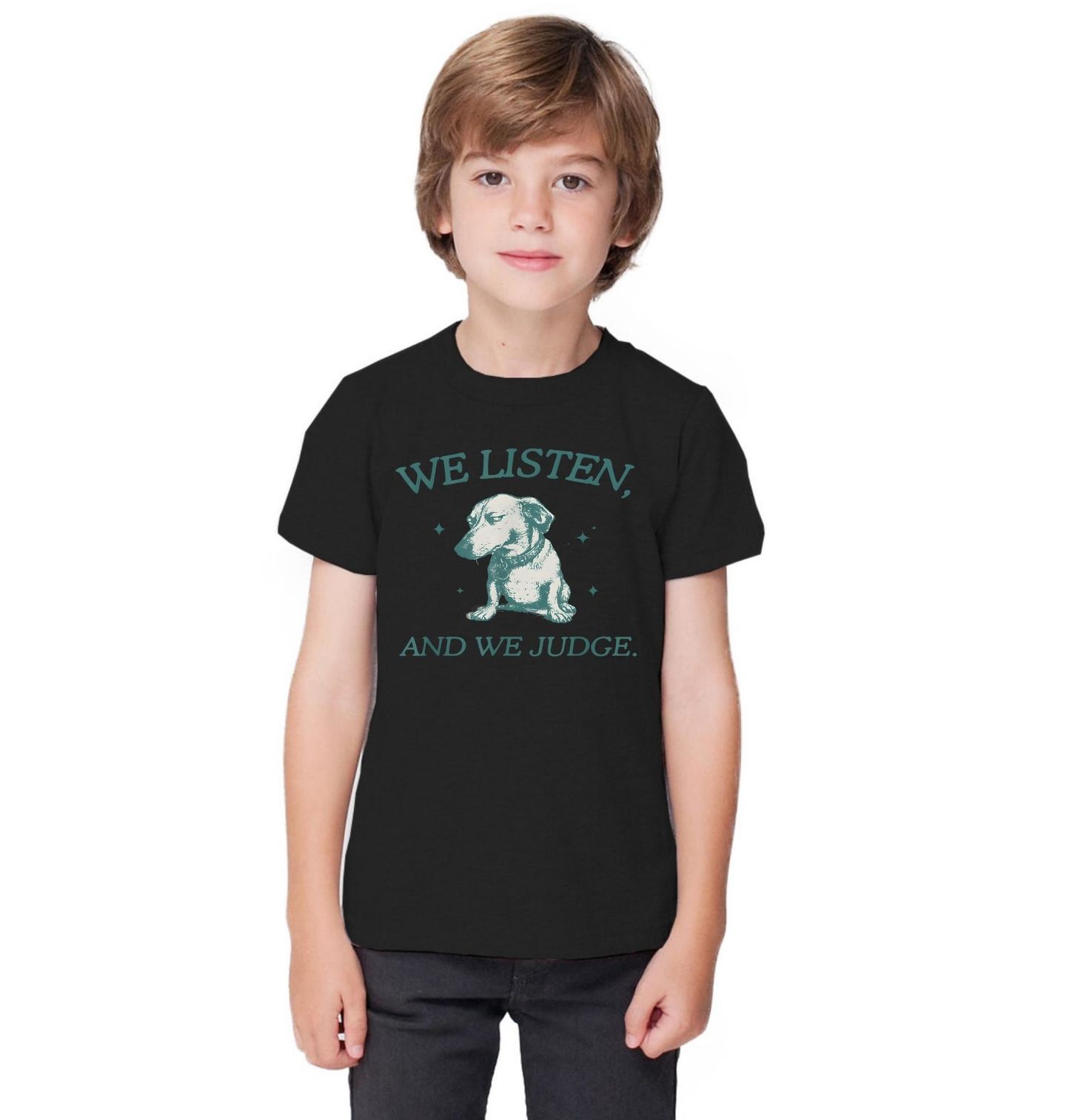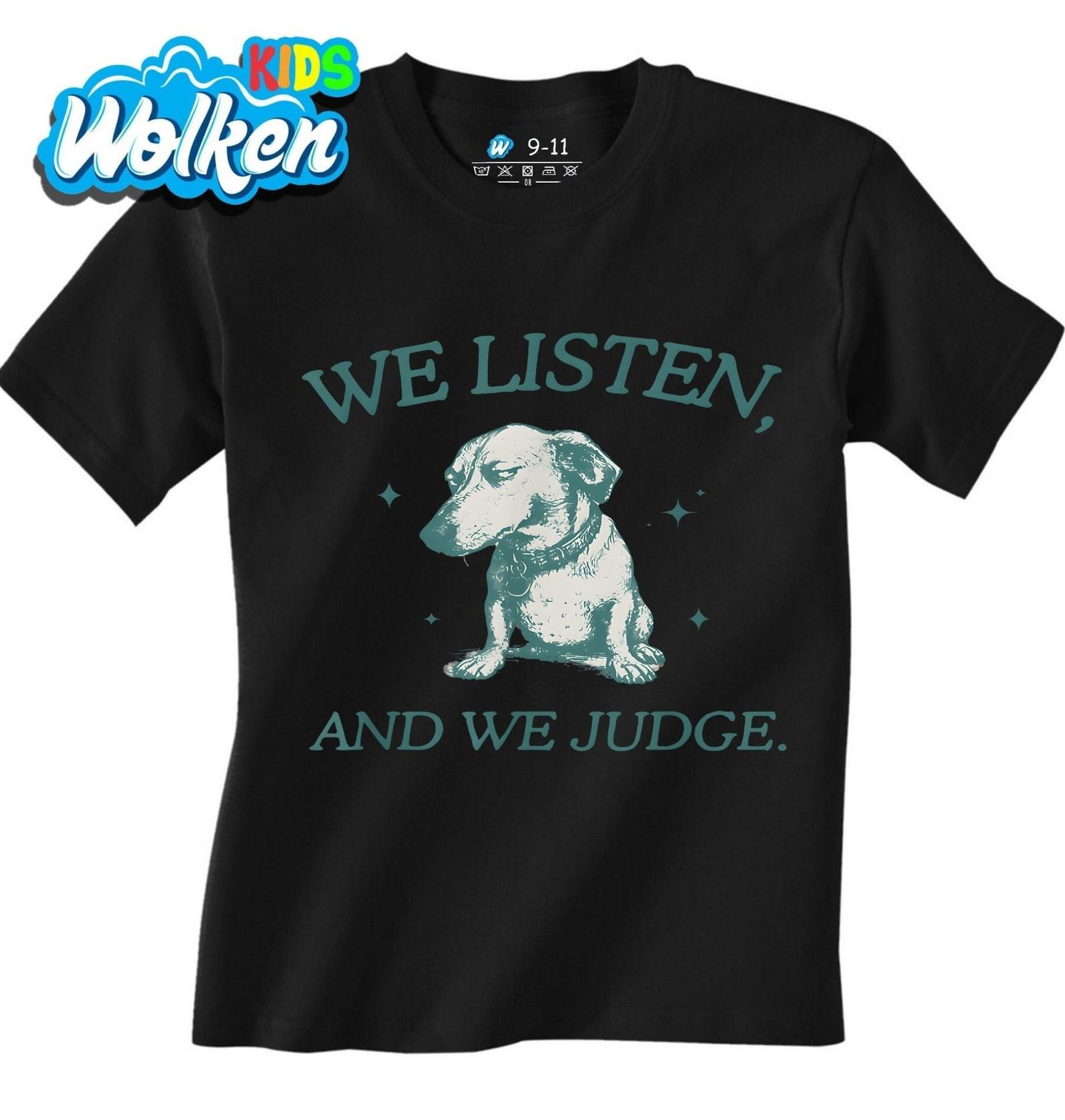Dětské tričko Odsuzující pohled Jezevčíka. „We listen, and we judge.“ = „My posloucháme, a pak soudíme.“ dokonale vystihuje povahu psů – trpělivě poslouchají, ale jejich pohled prozradí všechno. Roztomilý a zároveň ironický jezevčík s přísným výrazem působí, jako by byl skutečným soudcem.