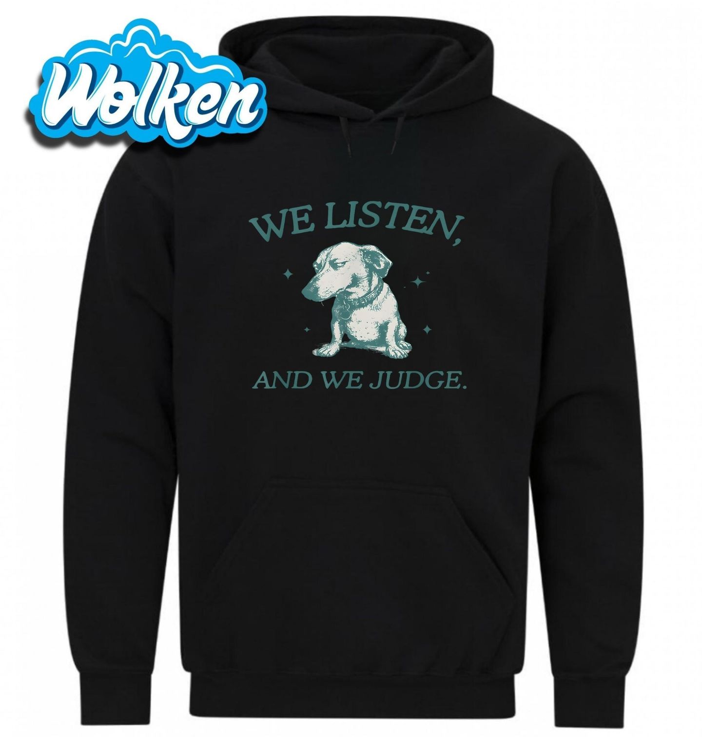 Pánská mikina Odsuzující pohled Jezevčíka. „We listen, and we judge.“ = „My posloucháme, a pak soudíme.“ dokonale vystihuje povahu psů – trpělivě poslouchají, ale jejich pohled prozradí všechno. Roztomilý a zároveň ironický jezevčík s přísným výrazem působí, jako by byl skutečným soudcem.