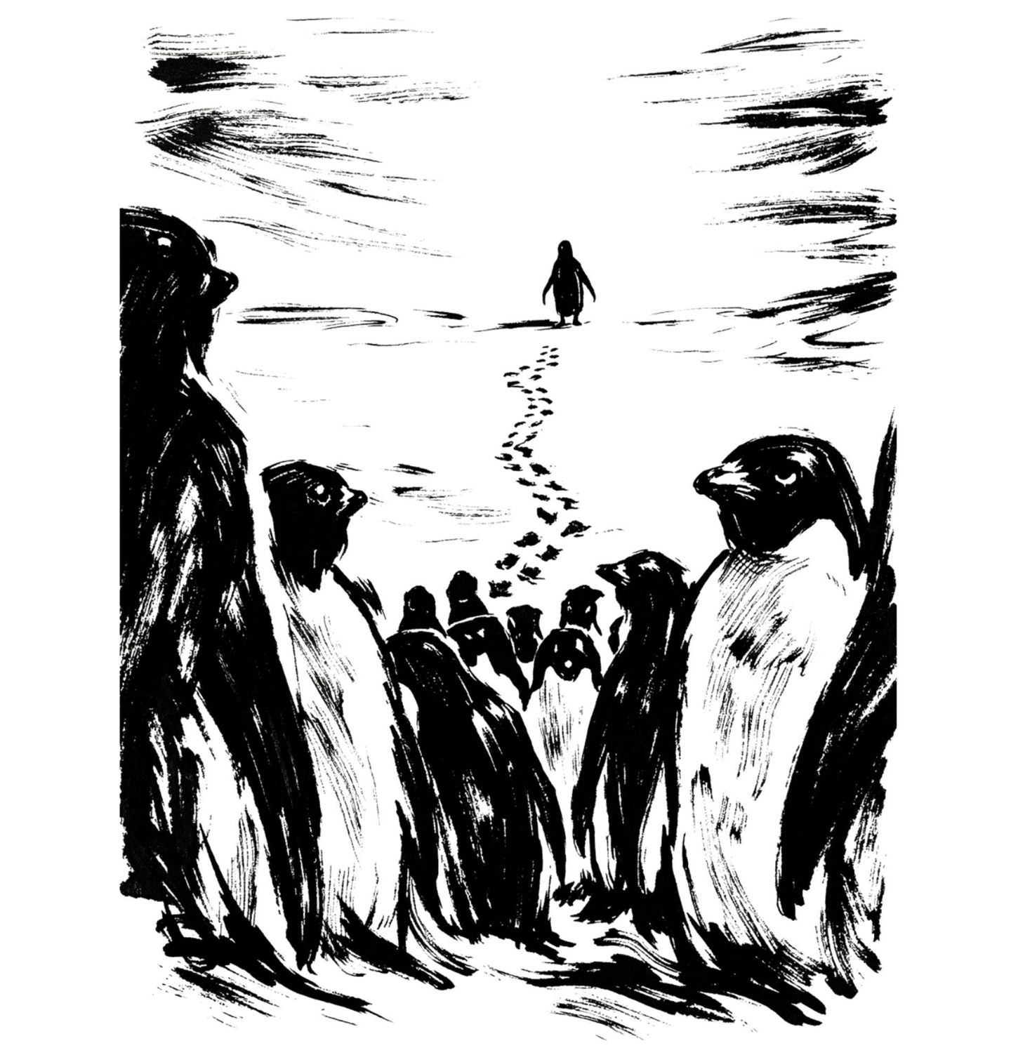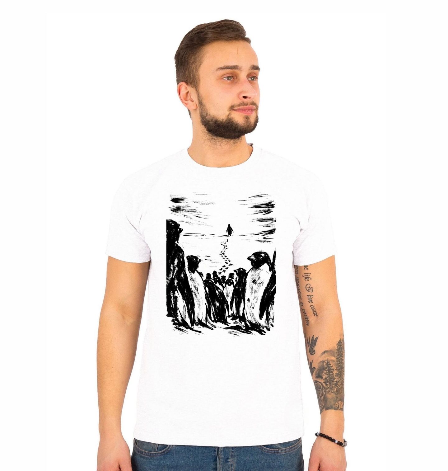 Pánské tričko Odvážný Tučňák But Why. Originální černobílý motiv zachycuje atmosférickou scénu, kde stojí skupina zvědavých tučňáků sledujících osamělou postavu na obzoru. Minimalistická kresba působí lehce melancholicky a zároveň vtipně – přesně ve stylu viral estetiky „but why“, která se šíří po internetu. Každý tučňák v designu dodává obrázku charakter a symboliku zvědavosti, nadhledu i tichého humoru.