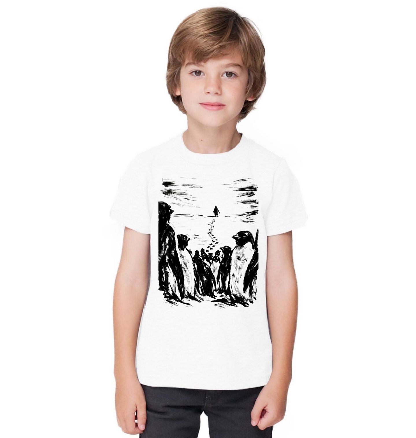 Dětské tričko Odvážný Tučňák But Why. Originální černobílý motiv zachycuje atmosférickou scénu, kde stojí skupina zvědavých tučňáků sledujících osamělou postavu na obzoru. Minimalistická kresba působí lehce melancholicky a zároveň vtipně – přesně ve stylu viral estetiky „but why“, která se šíří po internetu. Každý tučňák v designu dodává obrázku charakter a symboliku zvědavosti, nadhledu i tichého humoru.
