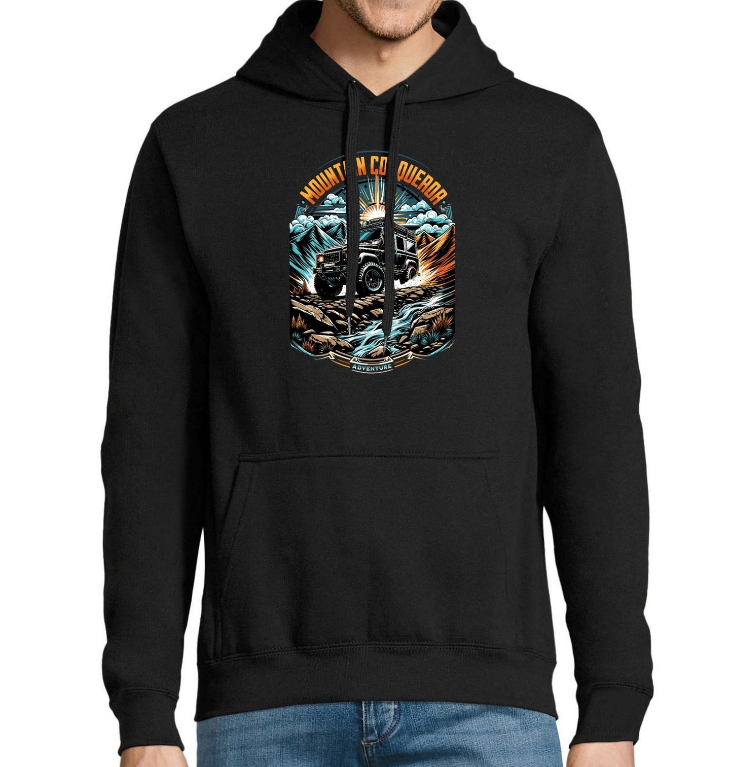 Pánská mikina Offroad Auto Mountain Conqueror. Potisk zachycuje ikonické offroad vozidlo v akci – s mohutnými pneumatikami, vybavením na střechu a odhodláním zdolat jakýkoli terén. V pozadí se tyčí zasněžené hory a západ slunce. Nápisy MOUNTAIN CONQUEROR a ADVENTURE jasně vystihují atmosféru trička – je určeno pro všechny dobrodruhy, cestovatele a milovníky aut