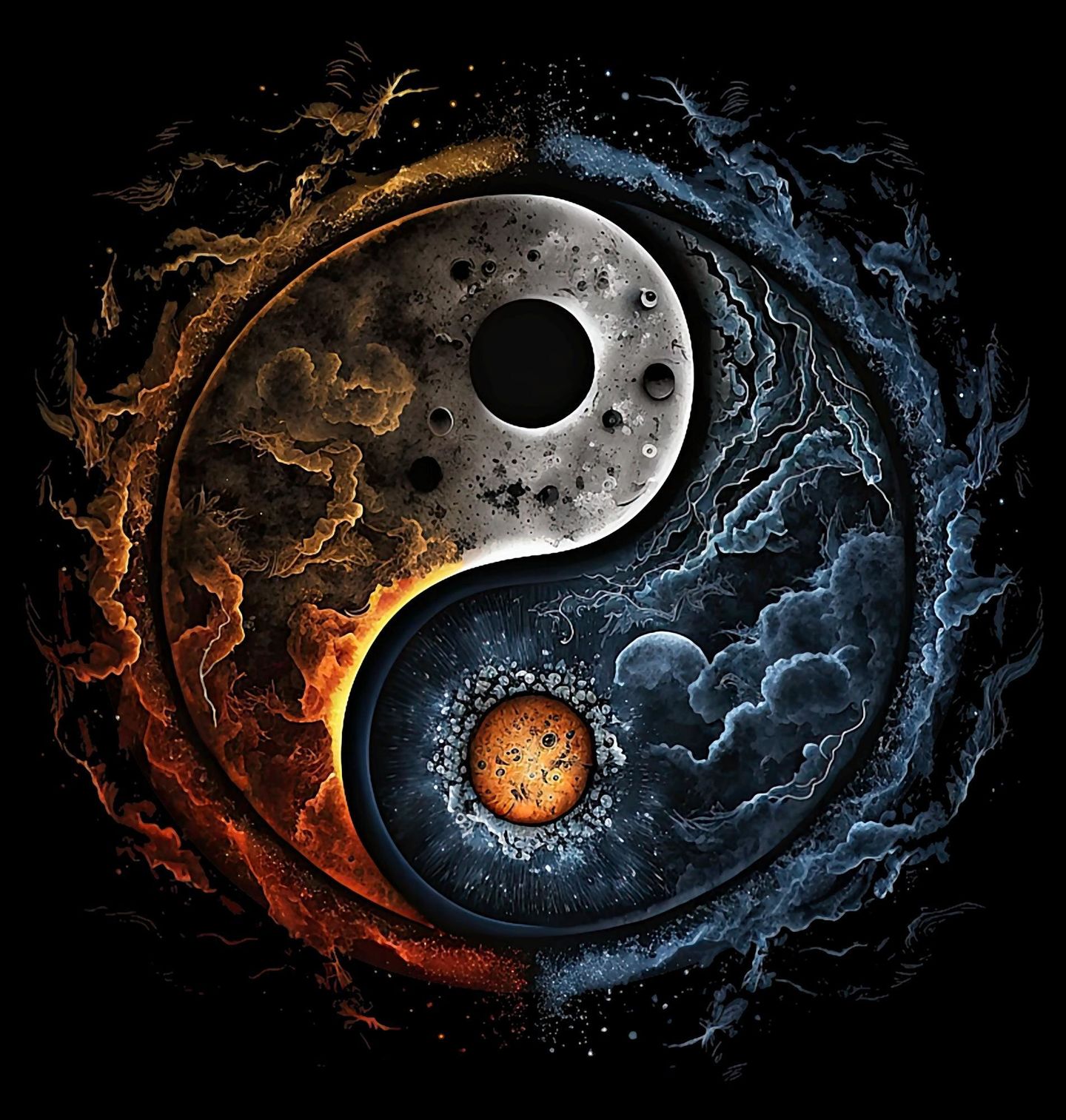 Pánské tričko Oheň a Led Jin a Jang. Originální design jin a jang zobrazený jako střet dvou živlů – ohně a ledu. Symbol jin a jang představuje rovnováhu mezi protiklady, světlem a tmou, teplem a chladem, chaosem a klidem. Tento motiv je ideální pro všechny, kteří milují duchovní symboliku, energii vesmíru a harmonii života.